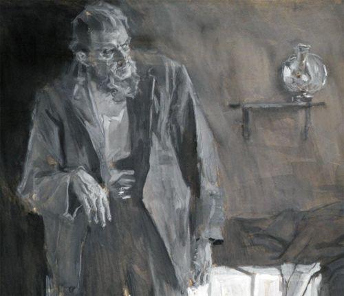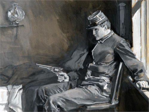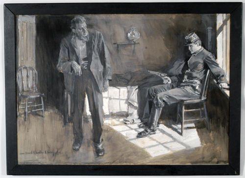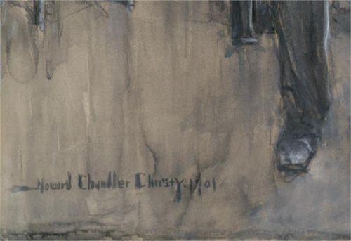 HOWARD CHANDLER CHRISTY 26"x37" watercolor partial label on back identifes work as an original illustration for George W. Cole's Cavalier, a copy is included dated 1901, CONDITION: light water stain running horizontally across standing figure's head as well as lower edge,