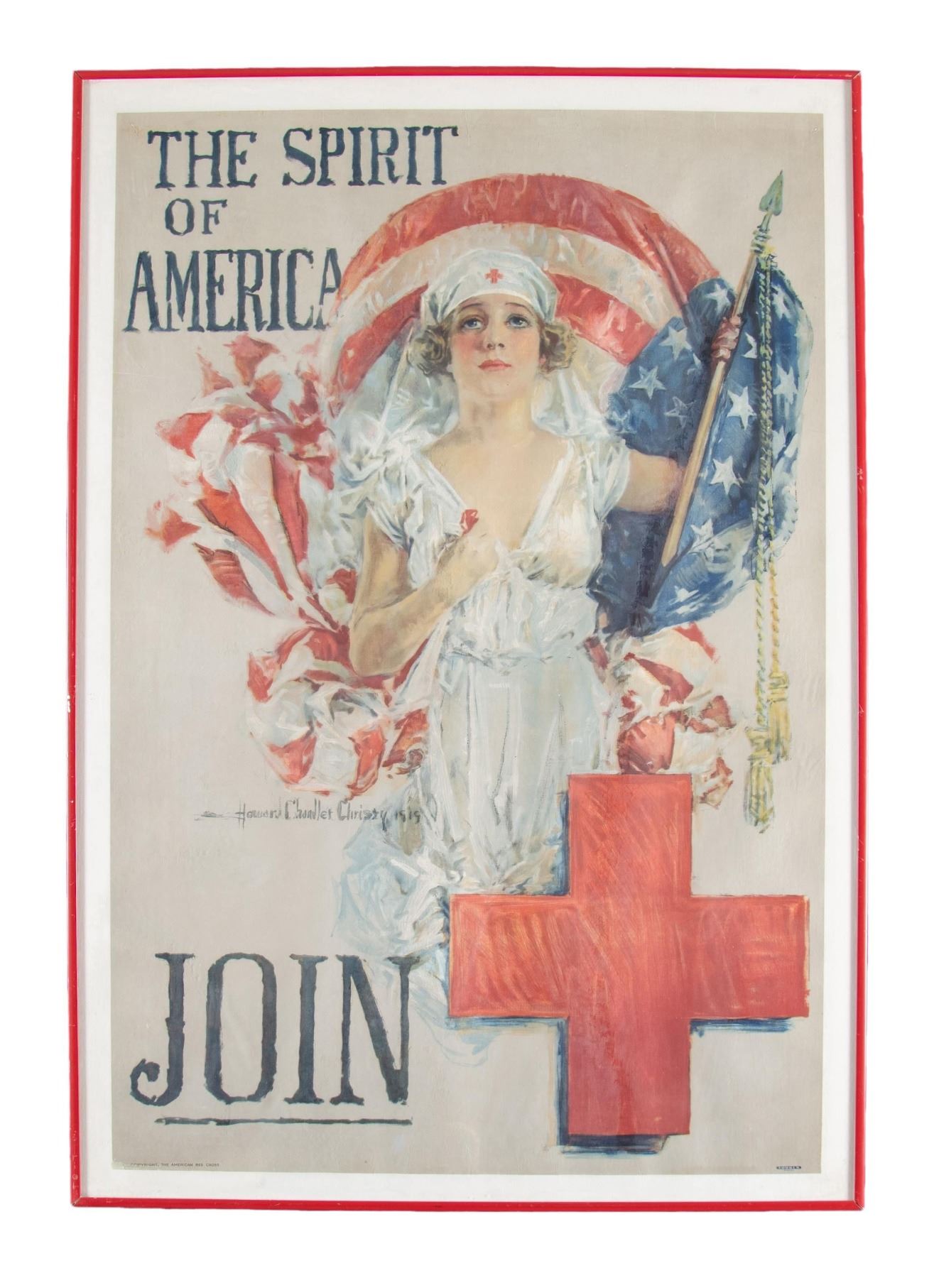 FOR THE AMERICAN RED CROSS. An approximately 20" X 30" recruiting poster. The poster showing an attractive young nurse holding an American flag and a large red cross in the lower foreground. The slogan "THE SPIRIT OF AMERICA" is at the top and the word "JOIN" is at the lower left. Signed by the author, Howard Chandler Christy, 1919. Marked in small letters at the bottom is copyright, B The American Red Cross. Forbes, Boston. CONDITION: poster has a small amount of edge wear in several spots and two slightly elongated holes in the top corners. Red Metal frame has slightly open corners w/ wear and small handling marks. (02-25131-4/RW). $700-1,000.