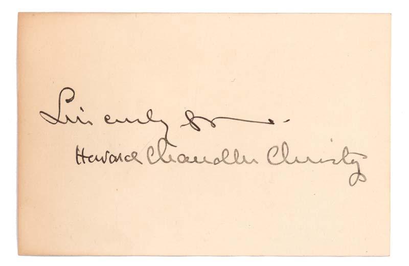 HOWARD CHANDLER CHRISTY (1873 - 1952) American artist famous for the “Christy Girl”, similar to a “Gibson Girl”. He painted Scene at the Signing of the Constitution of the United States. Signed card “Sincerely yours, Howard Chandler Christy”. 5” x 3 1/4”. Mounting trace on verso. Fine.