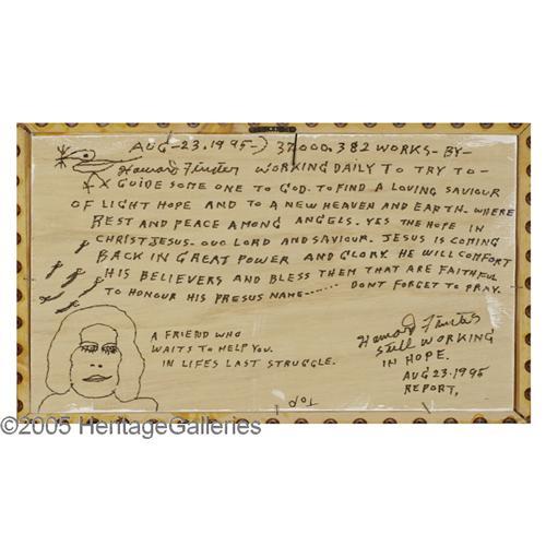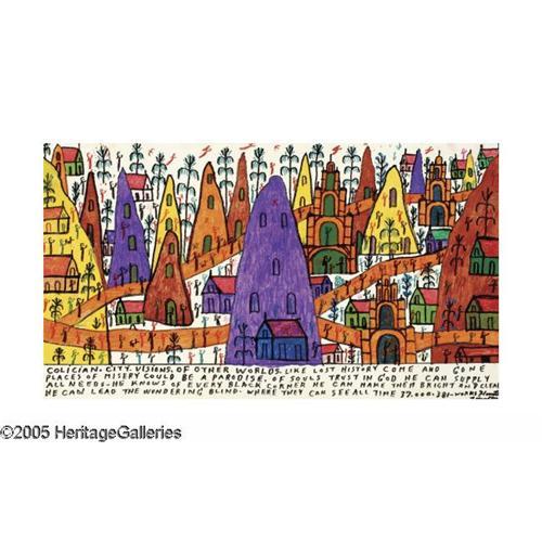 <B>HOWARD FINSTER (American 1916-2001)</B></I> <BR><I>Colician City, Visions of Other Worlds,</B></I> 1995 <BR>Mixed-media on wood, with handmade frame <BR>13in. x 21in <BR>Signed lower right: Howard Finster <BR>Numbered work 37,381