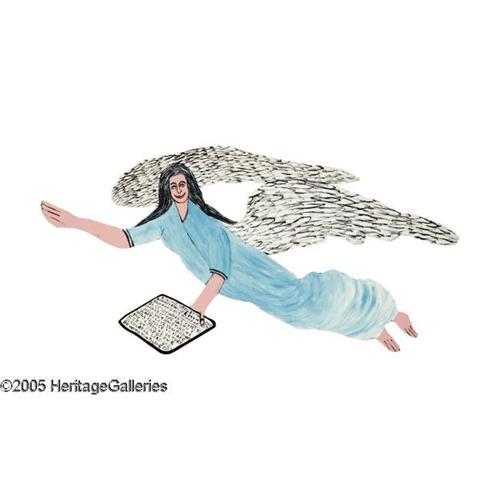 <B>HOWARD FINSTER (American 1916-2001)</B></I> <BR><I>Flying Angel ,</B></I> 1984 <BR>Mixed-media on wood <BR>21.5in. x 29in. <BR>Signed lower left: Howard Finster <BR>Numbered work 3,827