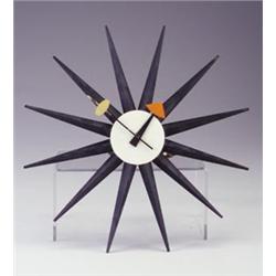 HOWARD MILLER "Starburst Clock" with black rays, white face, and black hands terminating in orang...