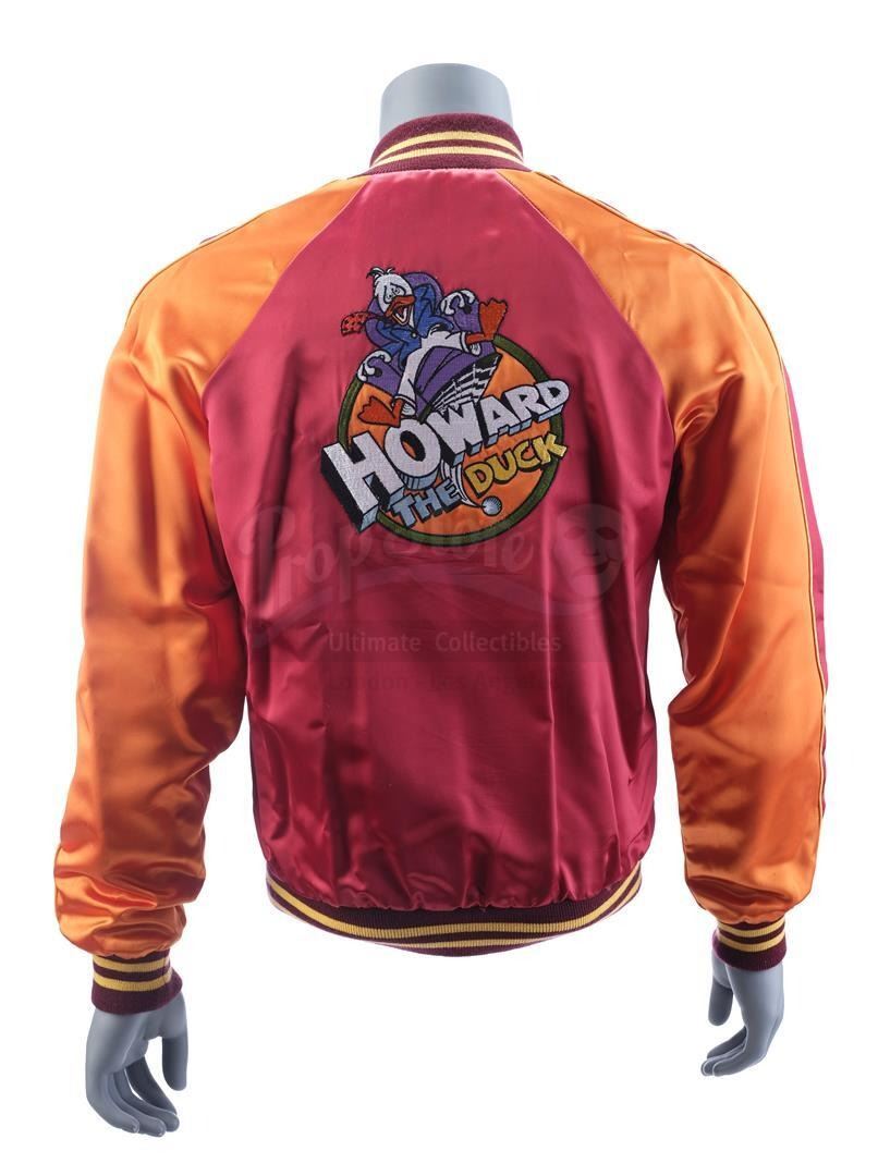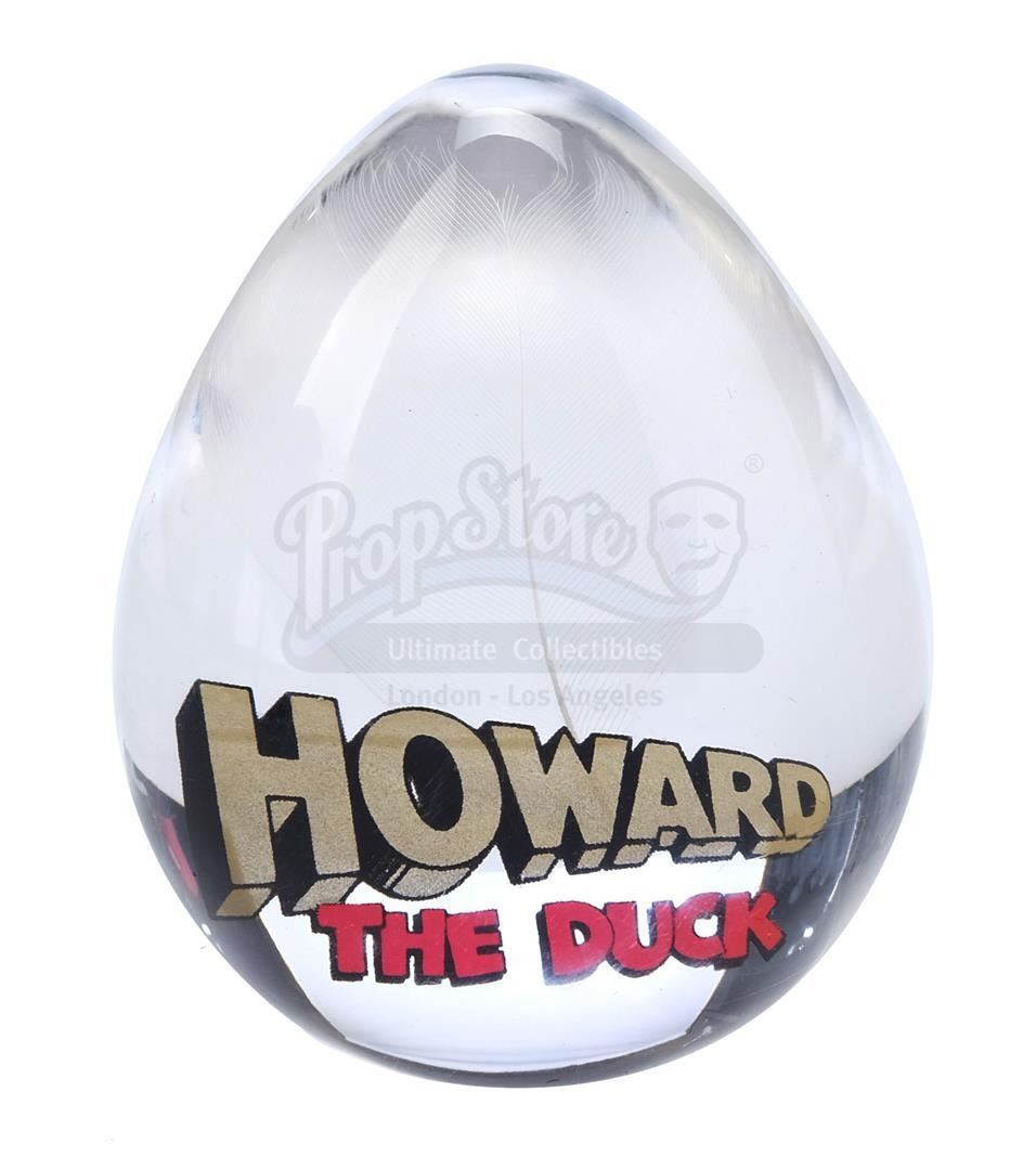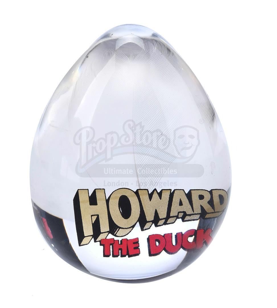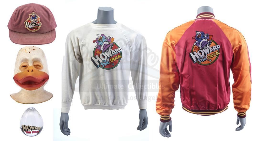 A production-made duck head appliance with a crew hat, jacket, shirt, and acrylic egg from Willard Huyck's comedy adventure Howard The Duck. A duck with humanoid characteristics was transported to Earth, where he teamed with a rock singer (Lea Thompson) to thwart an alien invasion.