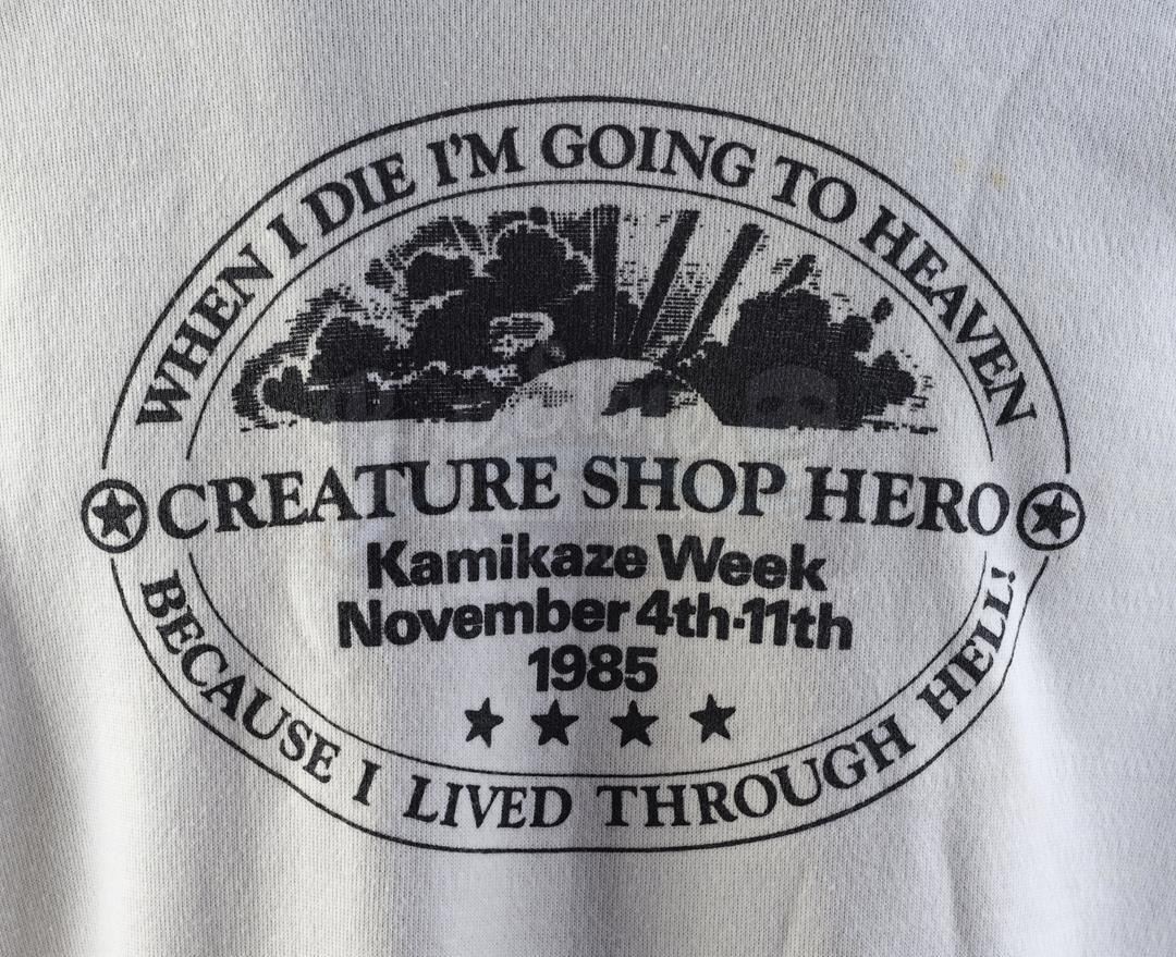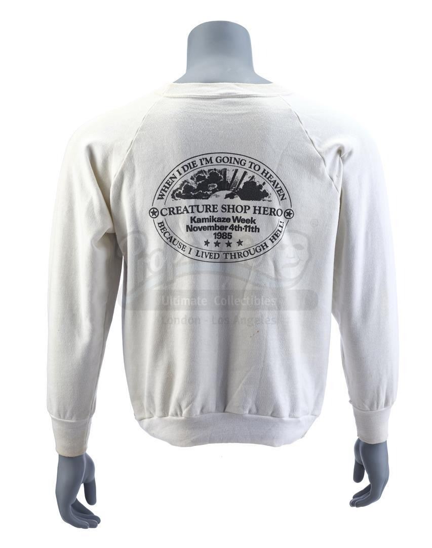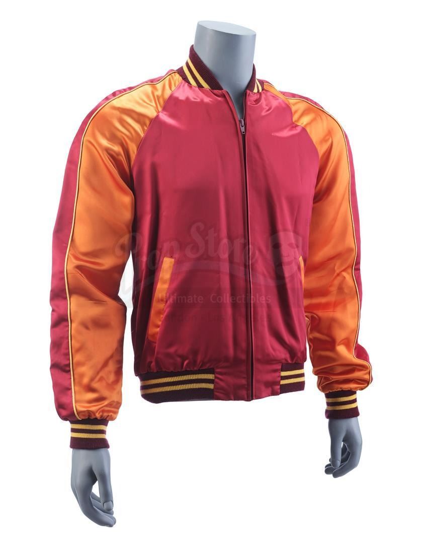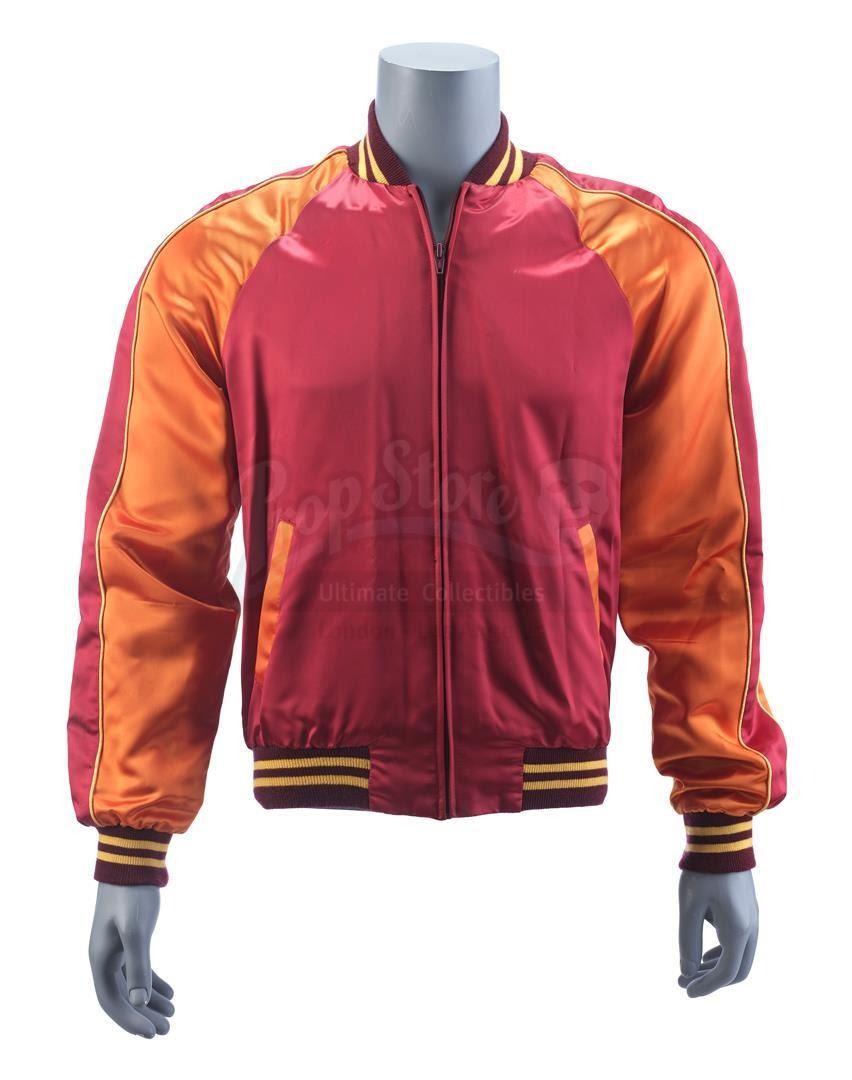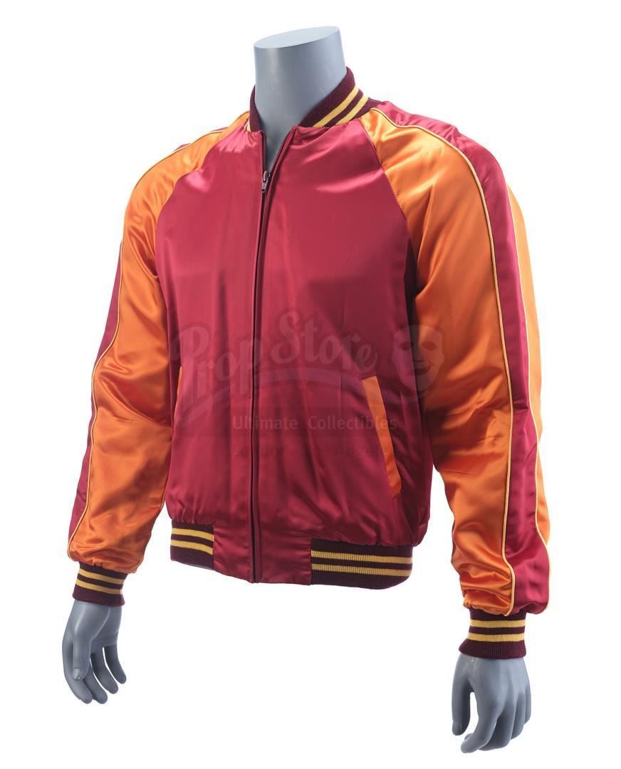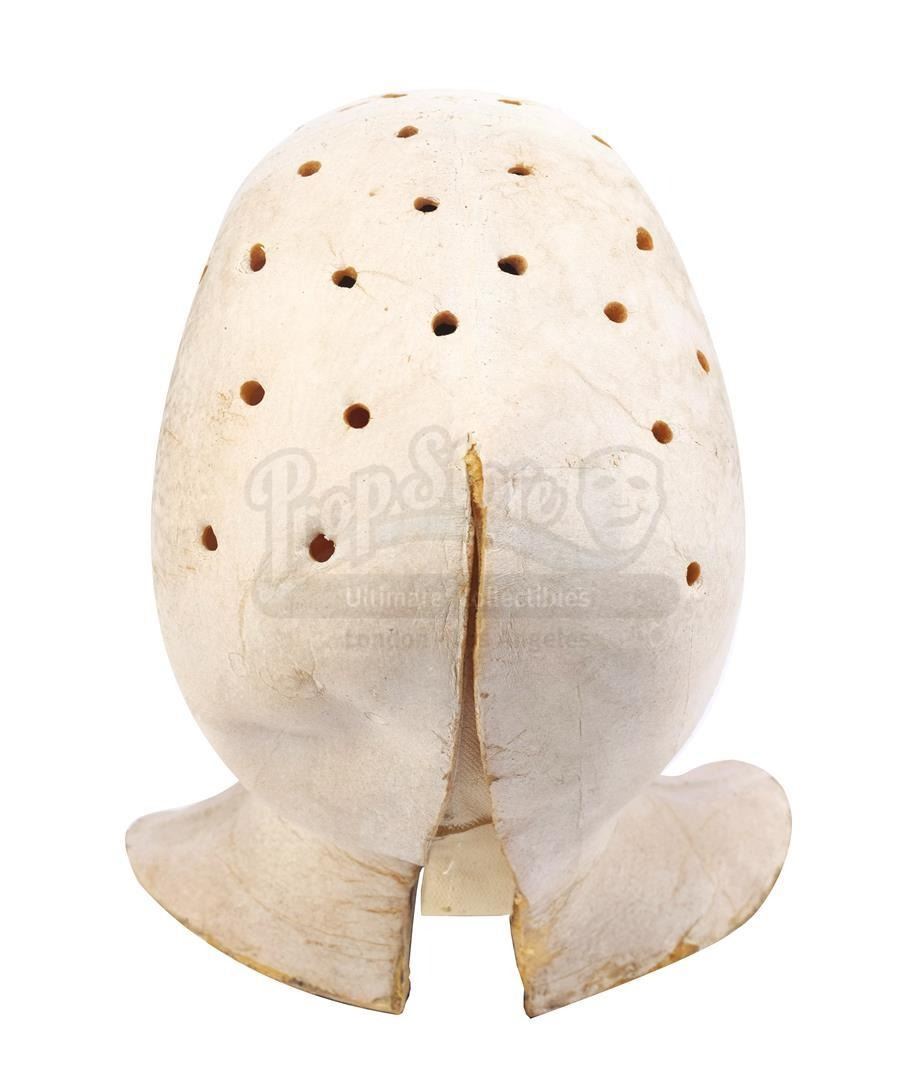 This lot consists of a white latex Howard head appliance made by production and marked "DEBBIE CARRINGTON" on the interior, as well as a collection of crew gifts, including a transparent acrylic egg with the film's logo and a white feather inside, a white cotton T-shirt, a purple cotton baseball hat, and an orange and dark red polyester blend, silk, and elastic jacket featuring elastic wrist and waistbands, all printed with a "Howard The Duck" graphic. The appliance and crew gifts are all in excellent overall condition with minor signs of wear including some paint cracking on the head appliance. Dimensions (largest): 39.5 cm x 28.5 cm x 37.5 cm (15 1/2" x 11 1/4" x 14 3/4"); (smallest): 7 cm x 5.75 cm x 5.75 cm (2 3/4" x 2 1/4" x 2 1/4")