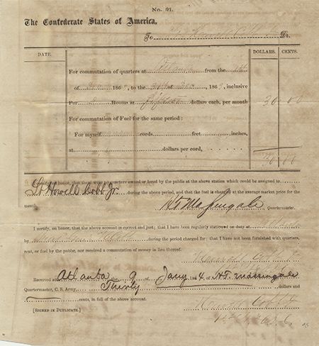 (1815 - 1868) James Buchanan's Secretary of War and one of the founders of the Confederate States of America who also served in the field during the Peninsular Campaign and Antietam. War date partly-printed D.S. signed four times, 1p.4to. on Confederate States of America letterhead, Atlanta, 4 January 1864, a requisition form mostly filled out in Cobb's hand for $30 worth of "Fuel", most likely cordwood. Usual folds, moderate uneven toning, else very good.