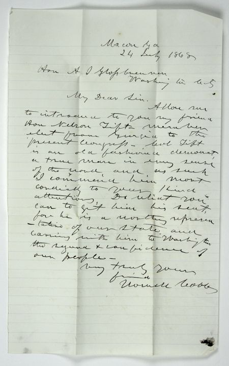 (1815 - 1868) American politician, congressman, and Secretary of the Treasury (1857-60). He resigned from the Treasury in December of 1860 citing that his home state of Georgia (then about to secede from the Union) was in need of his services. Although the Confederate congress appointed him brigadier-general, and was subsequently promoted to major-general, he took little part in military action. Very late A.L.S. 1p. 4to., Macon, Ga., July 24, 1868, to Adam J. Glossbrenner, James Buchanan's former secretary. In part: "...Allow me to introduce to you my friend Hon. Nelson Tift member elect from Georgia to the present Congress...Tift is an old fashioned...true man in every sense of the world...I...bring most cordially to your kind attention, do what you can to get him his seat, for he is a worthy representation of our state...". Nelson Tift (1810-1891) was a politician from Georgia who served in the 40th Congress as noted in this letter. Glossbrenner (1810-1889) was Democratic congressman from Pa. and acted as Buchanan's private secretary from 1860-1861. At the time of this letter, Cobb had resumed his law practice and, in early 1868, vigorously attacked Reconstruction efforts and denounced the radical Republicans in Congress. He would die on October 9, 1868, less than two months after penning this letter. With original holograph envelope, very good condition.