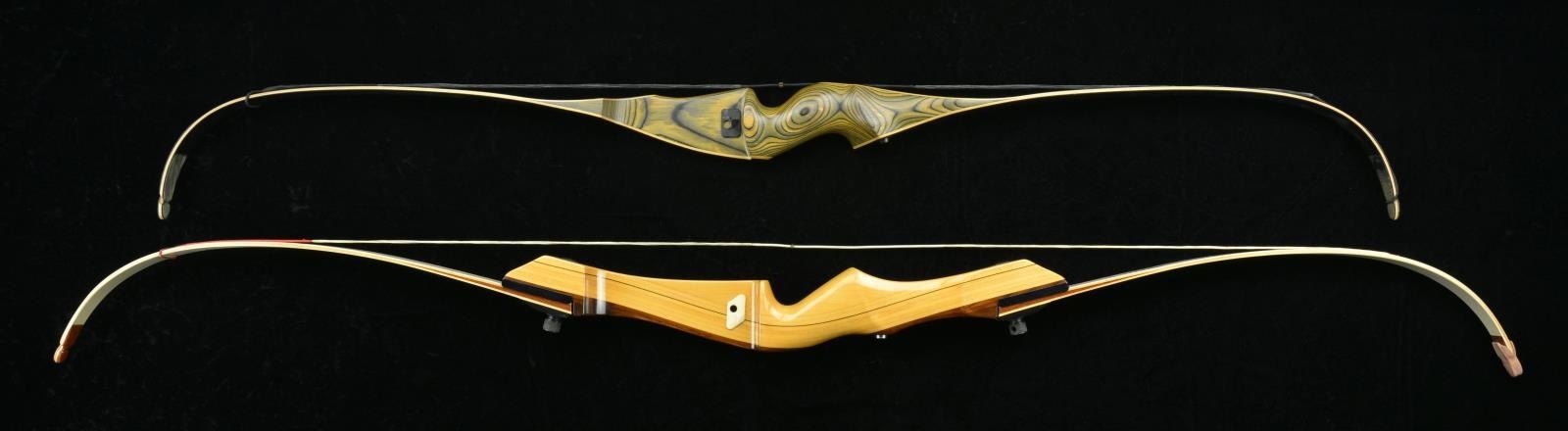 2) DAMON HOWATT MAMBA. Overall approx. 53" w/ off green & black laminated wood. Marked "65# @28" / HM 7456 AMO58". CONDITION: very good overall w/ light wear. (02-17211/MD). $150-300