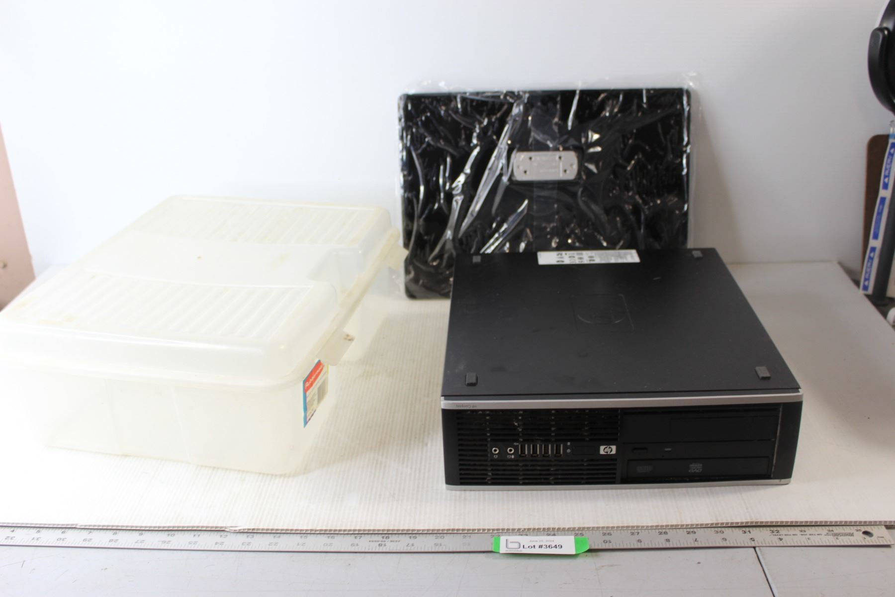 HP Computer Box (Untested), Rubbermaid 15.5L Bin, Panasonic Tv Base/Support?