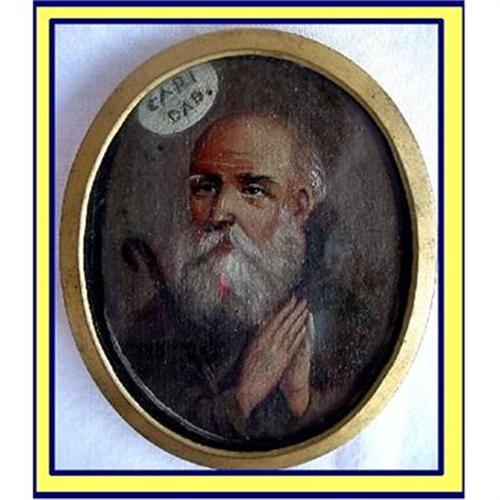 Handpainted in oil, dating to the 19th century. Portrait of St. Charitas, possibly another name for St. Francis / St. Peter / St. Christopher. In oval brass frame, measuring 2 1/2inches in height.<BR>A bald headed monk with full white beard and piercing black eyes, turns around, hands clasped in traditional gesture of prayer. He holds a shepherd's crook under one arm. In a 'bubble' above his head in Latin / Greek - appears to read "Capi Dab". The back of the frame, also in brass, is inscribed St. Charitas. <BR>Condition is very good.