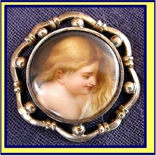 Miniature portrait of a beautiful young lady on porcelain, mounted in a gold coloured frame. 19th century, French or Italian. 1 3/4inches accross. Round, curved porcelain with head of a young woman, her hair flowing over her shoulders and a white garment covering one side, revealing the other breast. Beautiful Renaissance like features. Frame is most likely a low grade (9 or 10 carat) gold, but there are no marks. Condition is good.