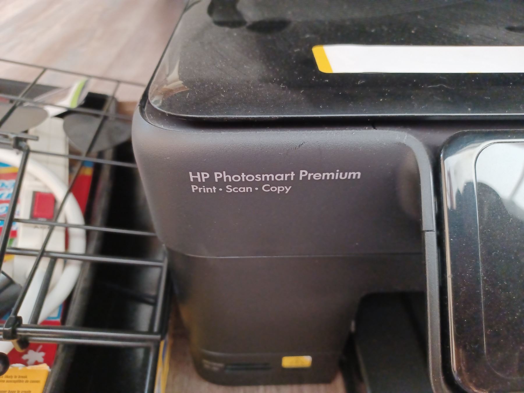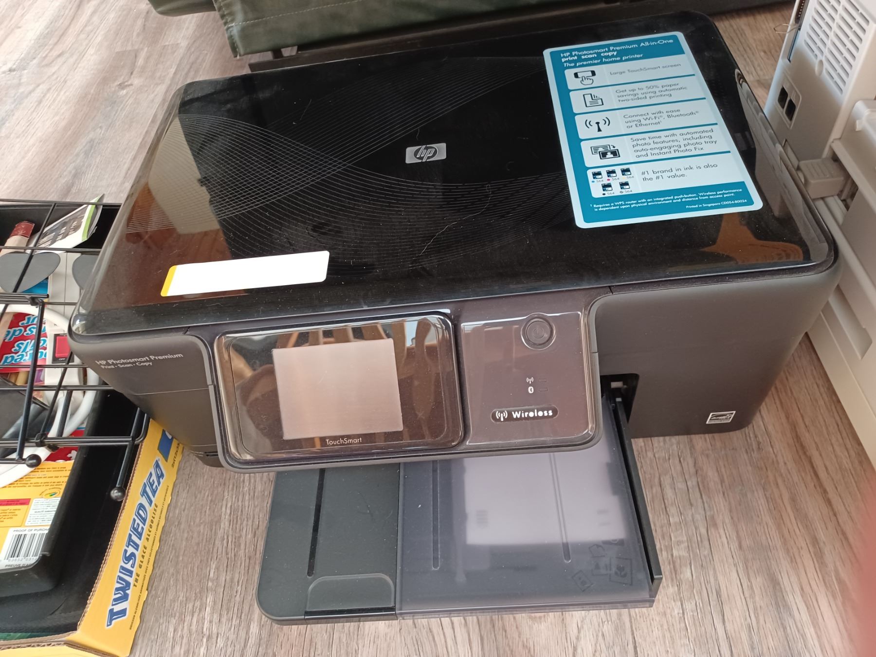 HP PHOTO SMART PRINTER AND A BOX OF OFFICE SUPPLIES