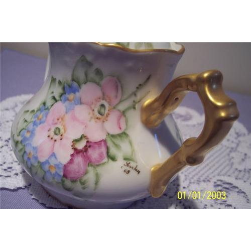 This teapot does not have a manufacturer's mark, so I cannot tell who made it. It stands approx. 6 inches high, and is handpainted with bright florals and signed by the artist. It is in excellent condition. A great little display piece.