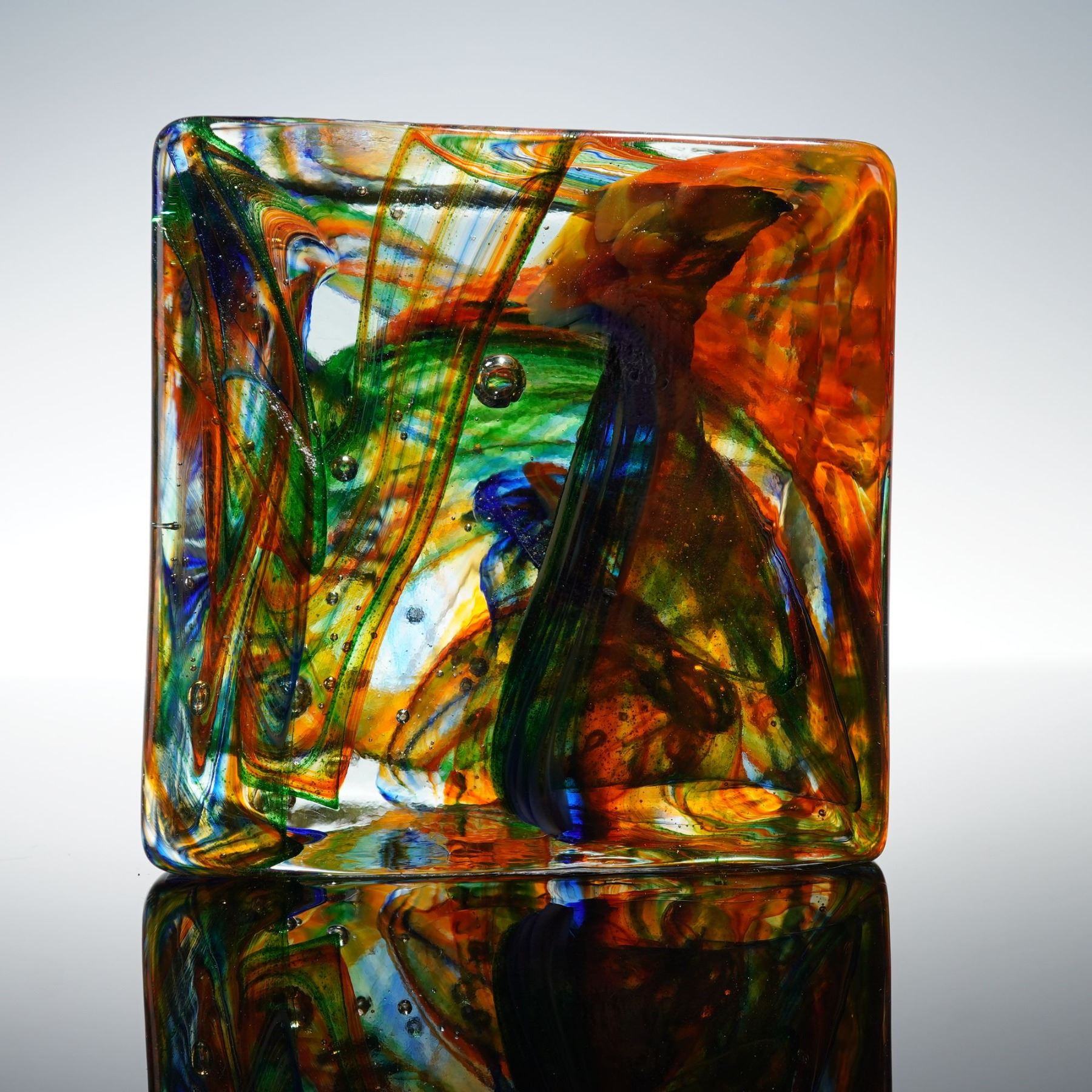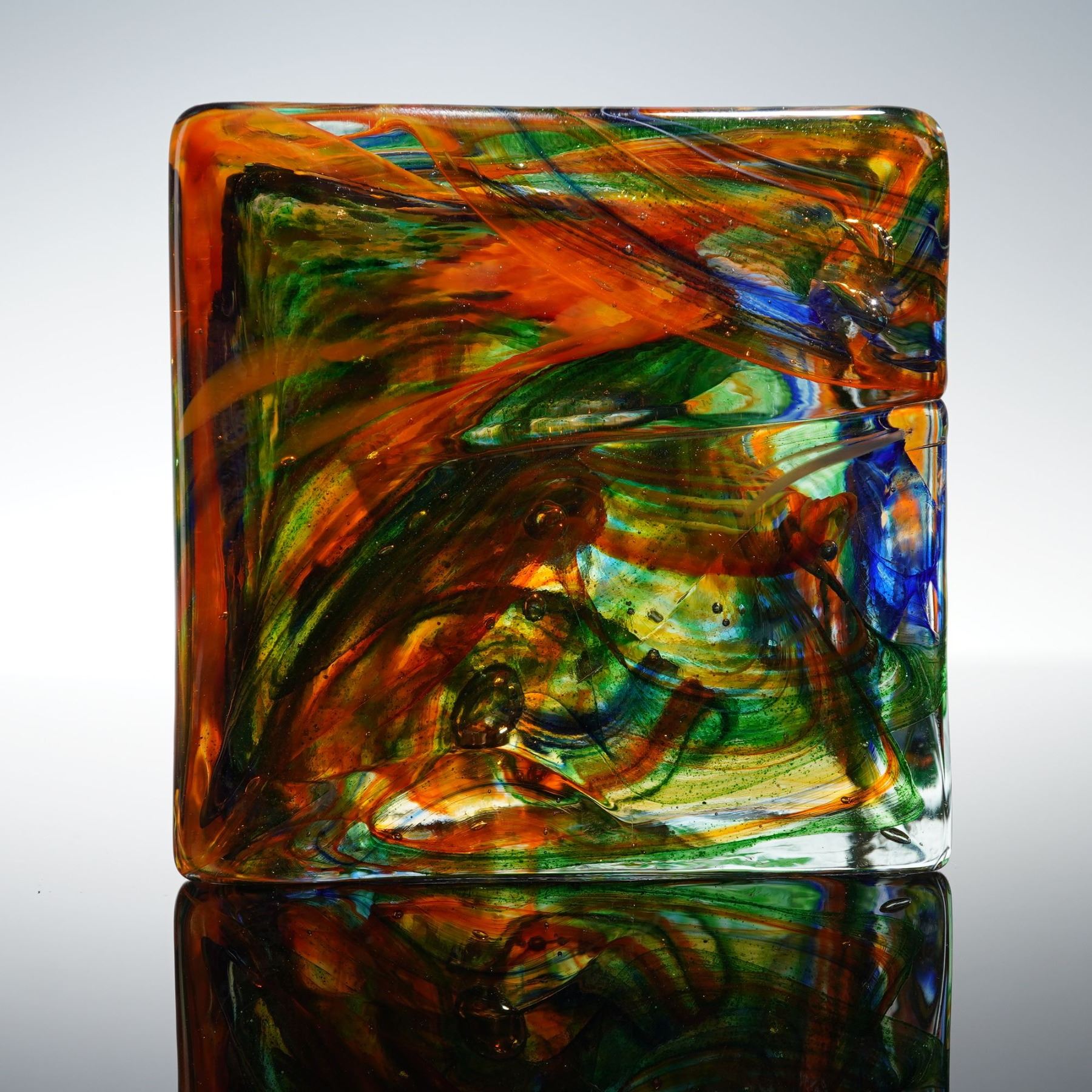 A vivid handblown art glass cube paperweight by HQT, showcasing swirling internal ribbons of orange, green, blue, and gold suspended within clear glass. The layered design produces a dynamic interplay of light and color from every angle. Retains its original HQT Hand Made label. A striking example of contemporary decorative glass craftsmanship.