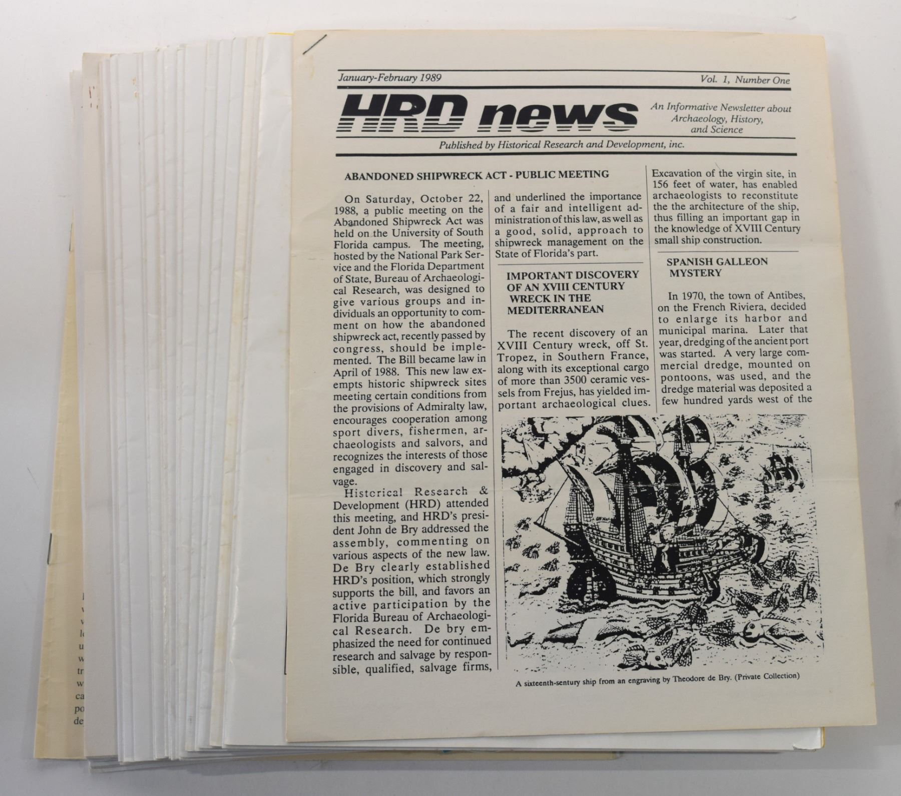 This lot contains issues of the popular historical archaeology newsletter, HRD News. HRD News was published by Historical Research and Development, Inc. and covered topics ranging from underwater archaeology to shipwreck history to Spanish numismatics to Florida history. Issues in this lot include: