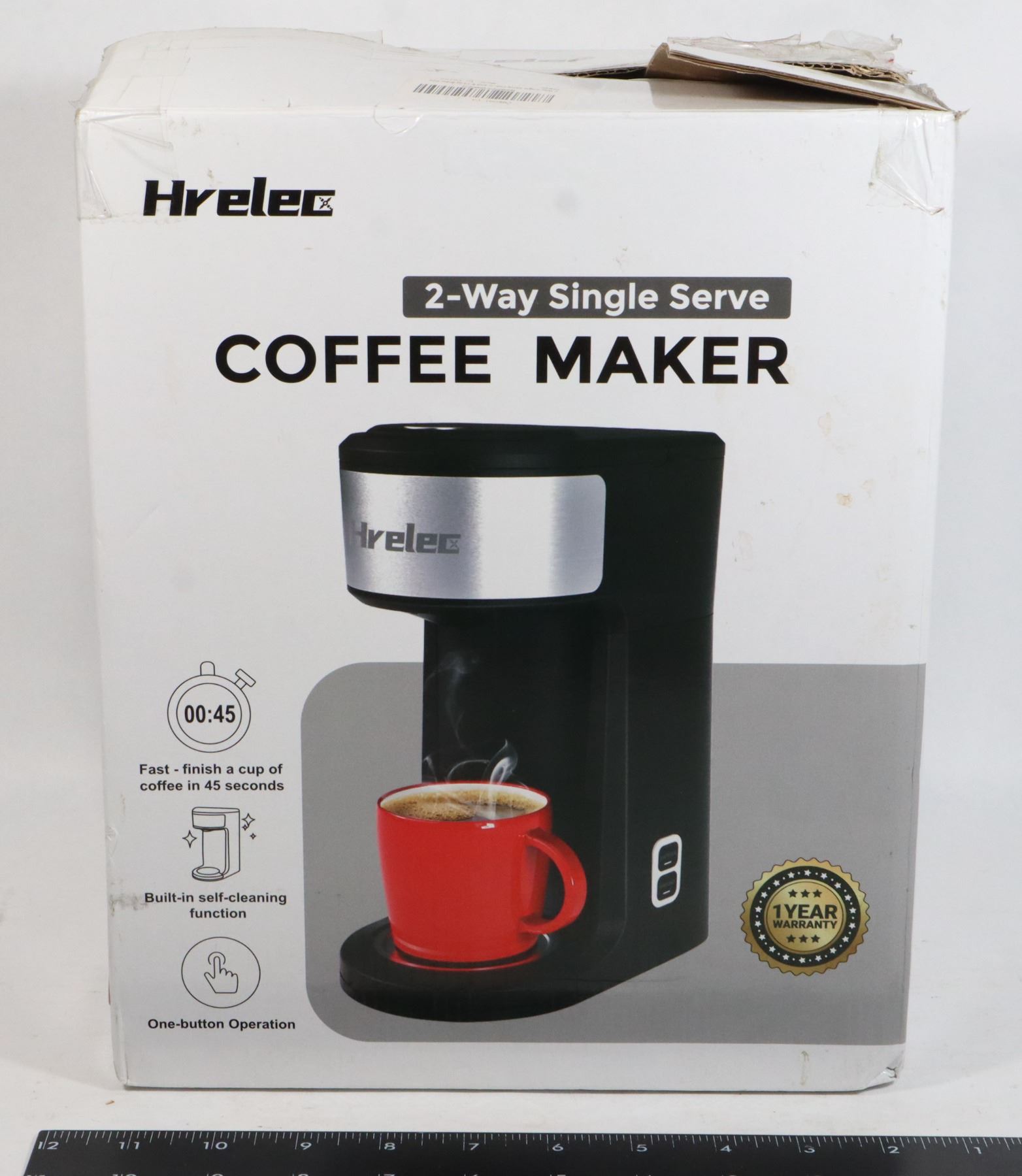 WITH REUSABLE GROUND COFFEE FILTER, OR USE SINGLE USE CUPS. NOT NEW, OPEN BUTTON STICKS A LITTLE BIT