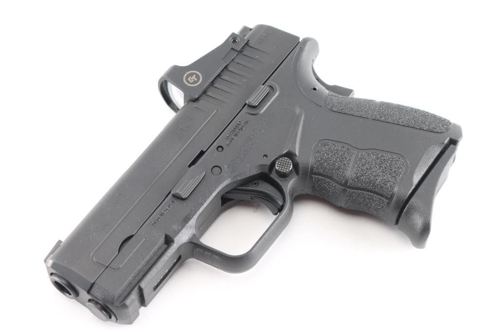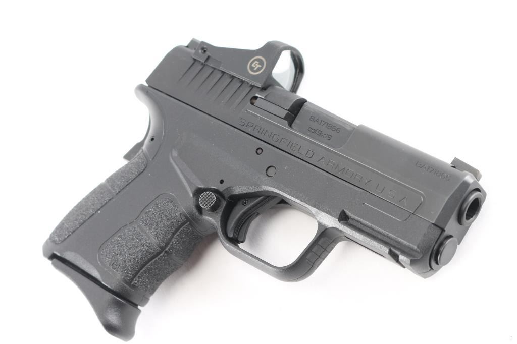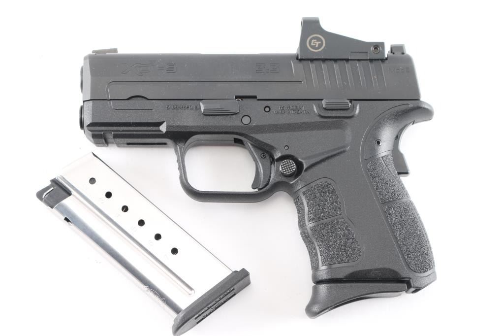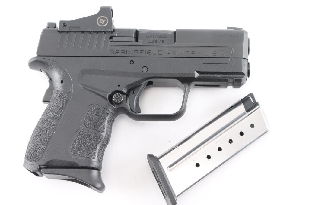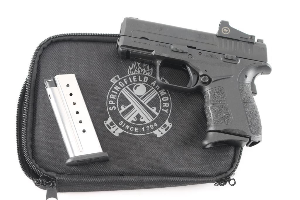 Mod 2 Croatian compact semiautomatic pistol imported by Springfield Armory, Geneseo IL. Features matte black finish, black polymer frame with accessory rail, 3.3" barrel, white dot front sight in dovetail, notch rear sight. CT red dot laser sight installed, good working order striker fired, loaded chamber indicator, manual safety in trigger, grip safety, ambidextrous magazine release. Condition is overall excellent with some friction wear on the barrel, bore is excellent/bright, Includes factory box with manual/documents, lock, soft case and 3 spare factory magazines, two with finger extensions, one flush. (4) total.Condition is NRA Excellent. Modern Firearm.