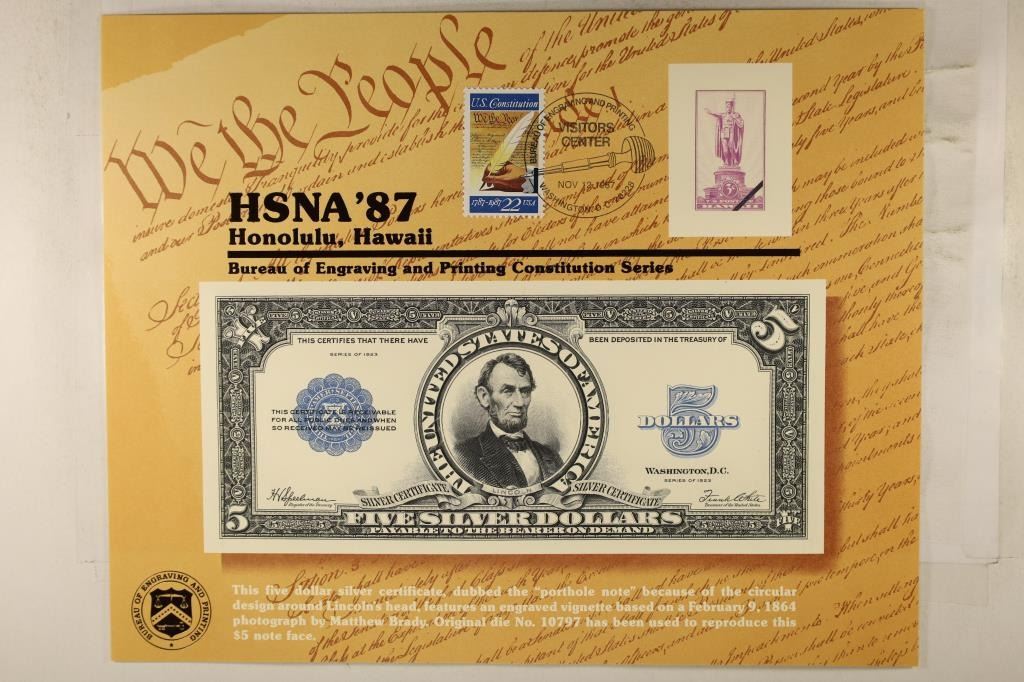 THE ENGRAVING OF A 1923 $5 US NOTE (OBV.) INCLUDES CANCELLED 22 CENT STAMP, PRINTED BY THE BUREAU OF ENGRAVING AND PRINTING
