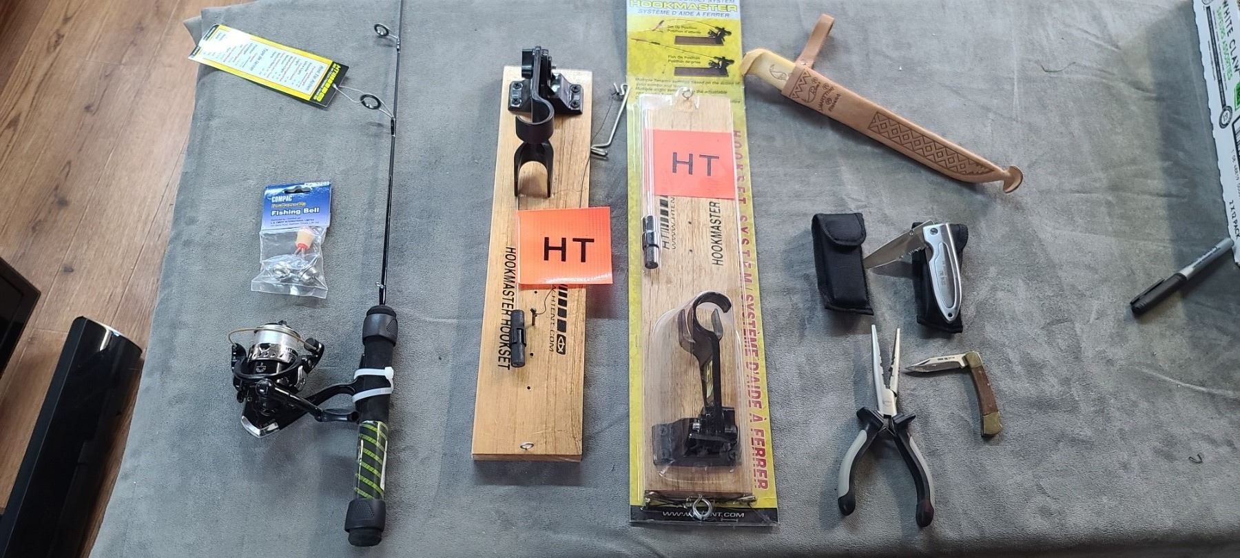 HT HI TECH ICE FISHING ROD NEW WITH TAG AND TWO ICE FISHING HT HOOK SETTERS, RAPLA PLIERS, AND MARTTINI FILLET KNIFR