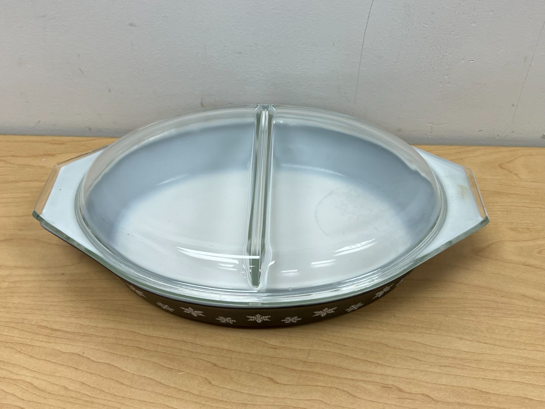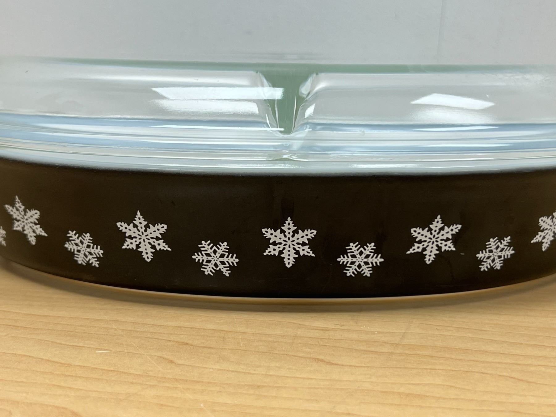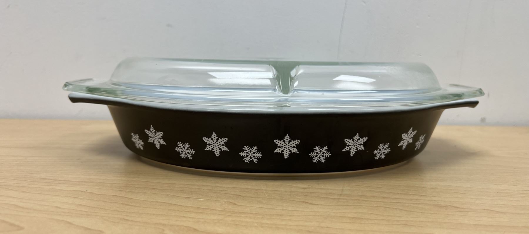 HTF Pyrex Charcoal Black Snowflake Divided Casserole with Lid 1.5 Qt very nice overall
