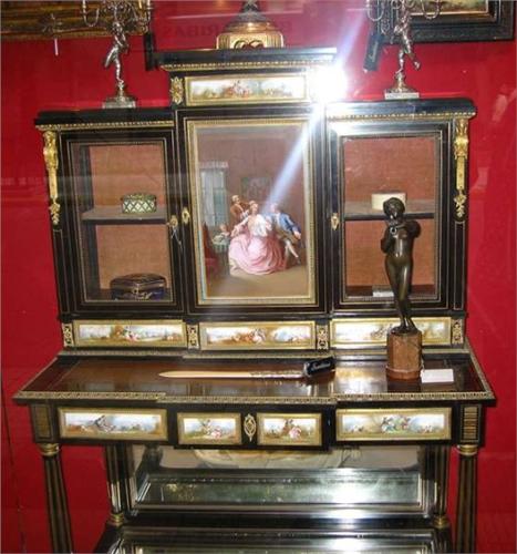 HUBERT-JOSEPH HEUBES - An antique French ebony and satin wood, porcelain inlaid, Bureau de Dames. The upper section features a handpainted porcelain panel with a period figural salon scene. The small drawers are decorated with similar porcelain plaques. Raised on fluted legs. Approx. 40" wide, 30" deep and 55" high. A rare piece. Circa 1870. ON REQUEST