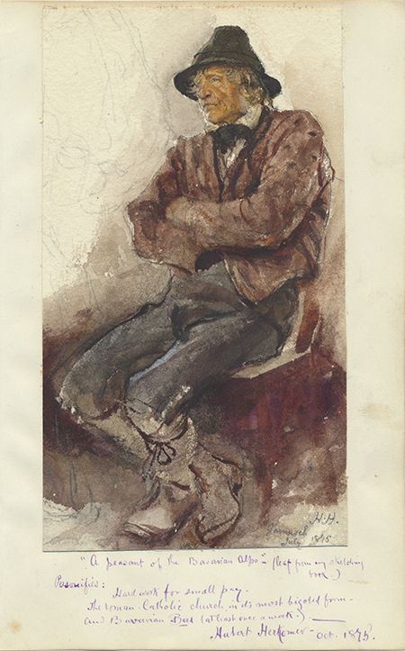 (1849-1914) British artist and film director best remembered for his painting Hard Times. Lot of two rare items, the first a small original painting from his sketchbook "A peasant of the Bavarian Alps" mounted to a small sheet, with notes beneath reading: "...sheet from my sketchbook...Personifies: Hard work for small pay. The roman Catholic church, in its most bigoted form, and Bavarian Beer (at least once a week). Hubert Herkomer Oct. 1895". Along with an 8vo. sheet of hand-written music for a composition entitled "While I sing my lullaby sonny", entirely penned on both sides in Herkomer's hand in purple ink and signed at bottom adding date 1875. Fine condition, two pieces.