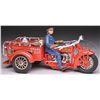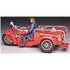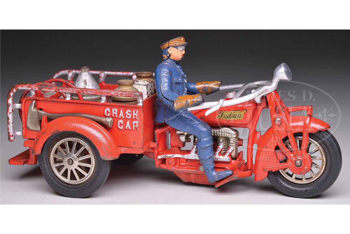 The largest of the Hubley crash cars, this toy features a driver in a blue outfit with tan gloves and hat, rubber tires covering nickel plated pressed steel spoked hubs, and an assortment of various items in the cart behind the driver. Included are a pair of nickel plated axes, a hose reel with original hose and nozzle, a first aid kit, and three simulated steel containers for the inevitable vehicular mishap. Motorcycle toys today are highly sought after by not only toy collectors but motorcycle enthusiasts as well. This particular vehicle is a replica of a 1930s four cylinder Indian motorcycle. SIZE: 11-1/2" l. CONDITION: Spectacular original condition and considering the frequency of the driver being removed from his seat, there is absolute minimal wear or chipping to the tank area. Indian decals are largely intact. And most obvious wear is to the silver railing on the crash car itself. At first glance, one does not notice the casting flaw on the front wheel fender of the motorcycle. Toy has been fully inspected and black light confirms that the toy left the factory with this flaw as paint is intact and shows no evidence of touch up and/or repair. 1-13097