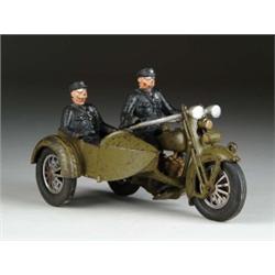 HUBLEY HARLEY CYCLE AND SIDE CAR. U.S.A. Desirable army-green V-Twin Harley with uniformed police riders. Hubley toy is well marked with two decals reading “HARLEY DAVIDSON.” Casting of toy and tires are marked “HUBLEY.” SIZE: 9” l. CONDITION: Motorcycle and side car are original with good to very good paint. Riders are repainted. WP 1-3771 (750-950)
