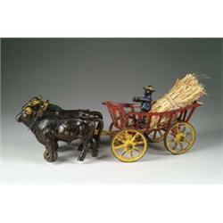 HUBLEY HAY WAGON WITH OXEN. Red enameled wagon w/yellow wheels & yoke supporting two huge oxen that are japanned with yellow horns. It is driven by a standing “darkie” dressed in green shirt, black pants and yellow hat. SIZE: 15” l. CONDITION: Good with overall wear. MC 1-4128 (700-900)