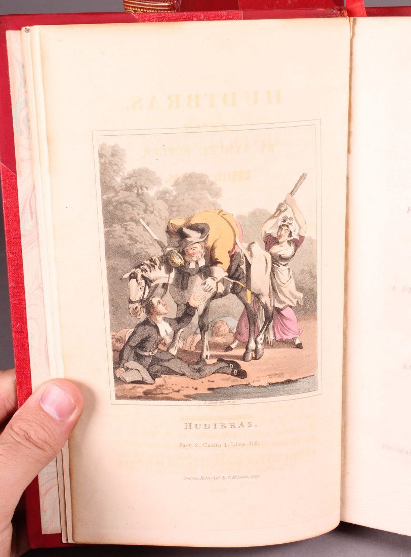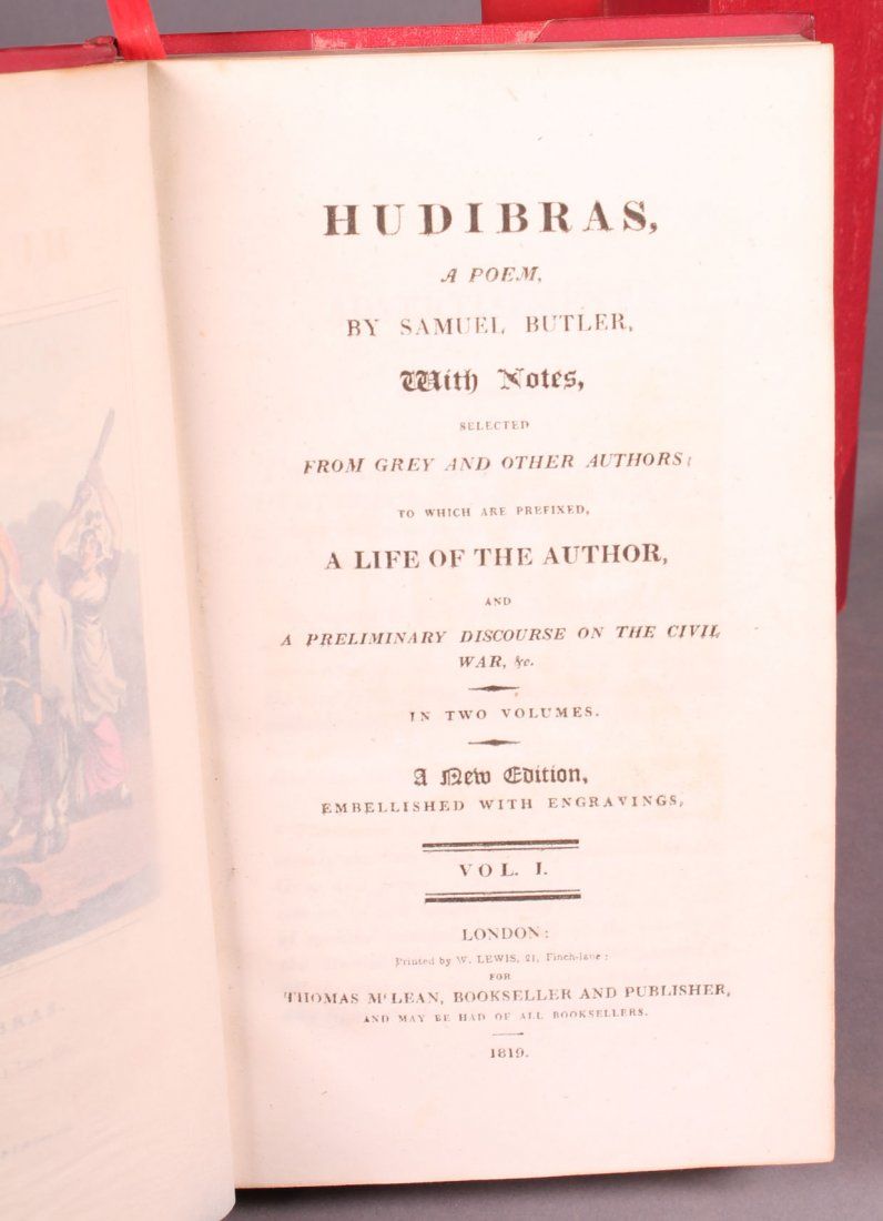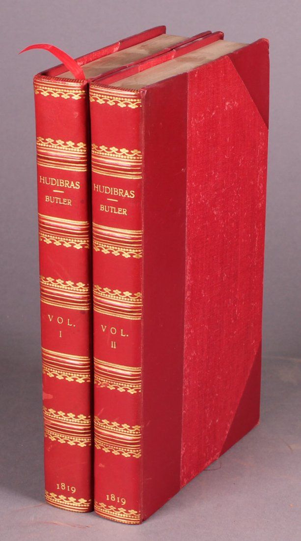 [Butler, Samuel]. HUDIBRAS, A Poem, by Samuel Butler, With Notes selected from Grey and other Authors; to which is prefixed, A Life of the Author, and a Preliminary Discourse of the Civil War? A New Edition, embellished with Engravings. 2 Vols. London: Printed by W. Lewis? for Thomas M?Lean? 1819. 8vo. Vol I: lxxxiv, [ii], 444pp. Vol II: 494pp. Red half leather and marbled board by Charles E. Lauriat, Boston, teg, marbled eps. 12 hand-colored plates by J. Clark (incl frontises). Tooley 141.