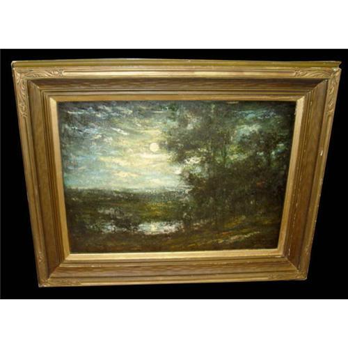 HUDSON MINDELL KITCHELL born 1862 - 1944. The painting signed H M Kitchell lower right, lumincent impressionist wooded moonscape painting measuring 22 inches x 30 inches mounted in an ornate gilt American Arts and Crafts frame measuring 31.5 inches x 39.5 inches. There are no repairs or restorations to the painting. There is some drying and crazing of the paint which is common for Kitchel works and some minor normal wear to the frame. Overall a very clean early work which would make an impressive addition to any fine American art collection or household.