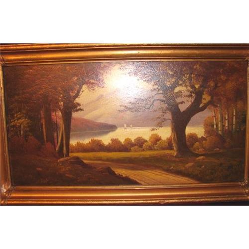This is a Oil Painting on Board of The Hudson River in New York Estate by John A. Coulthrup who is listed in Davenport and Who Was Who in American Art. The price asking is right in the area that his paintings have sold for. Coultrup was born in Kannsas in 1888 and he died at the age of 94. He also was a long time resident of Long Beach, Ca. and is probably best remembered for his paintings of rolling waves crashing on the beach. However he did travel extensively throughout the United States considerably and painted many mountains and lake landscapes. He was reported to be a very tall man measuring almost 7' in height. The frame has a loss on the lower left side. The painting is in Good Condition with just a few areas of fading in the sky and lake. The painting is signed "Coultrup" in his usual manner to the bottom left and the title "RIVER HUDSON,N.Y. in pencil on the verso.