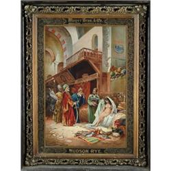 HUDSON RYE WHISKEY TIN SIGN. Extremely rare sign from this distillery, entitled βTHE SLAVE MART.β Colorful illustration shows a gathering of mid-Eastern Arabs in the market place and a nude damsel, which would appear to be the object of their attention. Mayer Bros. & Co. Distillers, Cincinnati, U.S.A. Appears to be in the original frame and shadow box. SIZE: Image 19β w. x 27 1/2β h. CONDITION: Sign has strong, bright colors and is exceptionally clean with only a handful of small surface blemishes and one nail puncture at extreme left corner. PF 1-4399 (3,000-5,000)