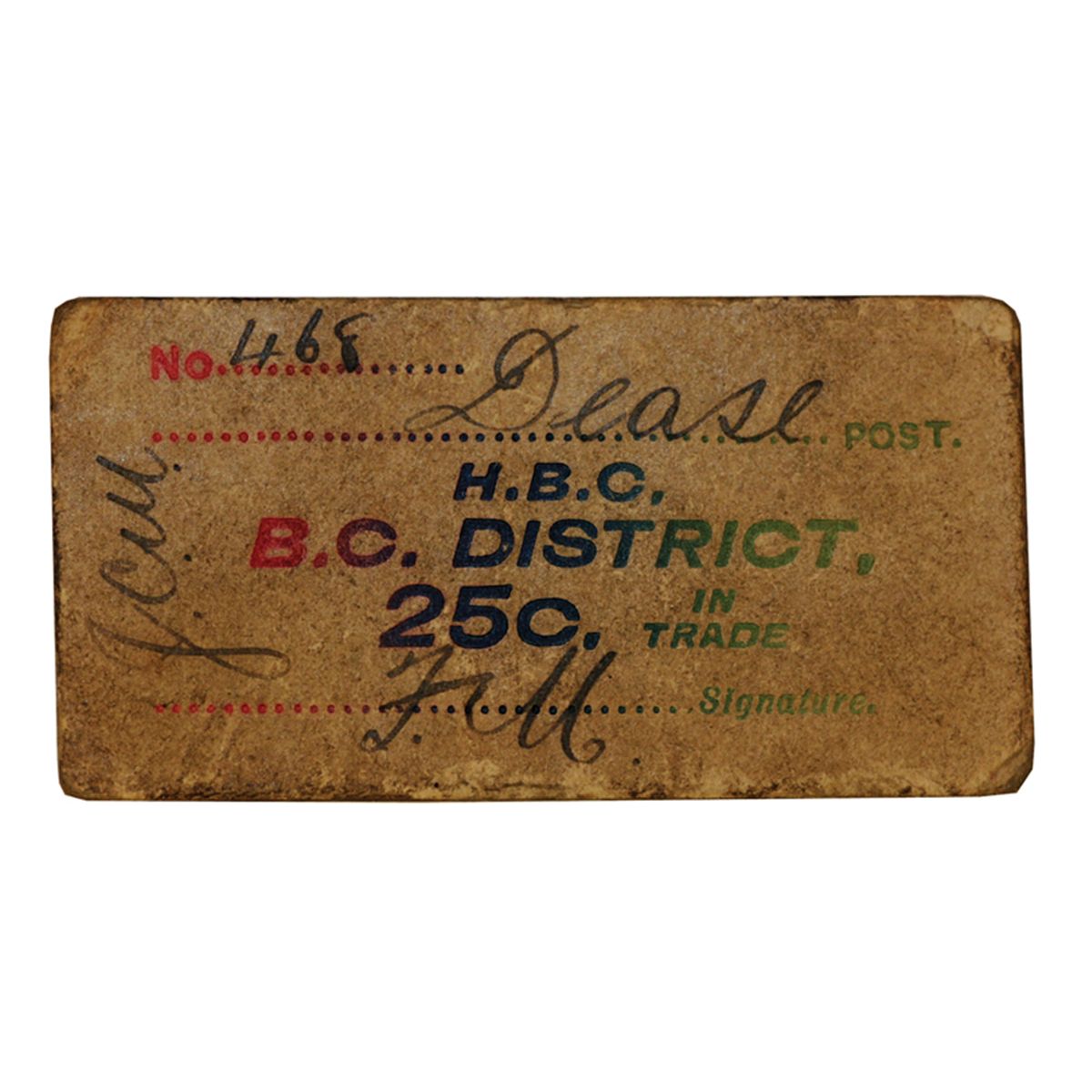 HUDSON’S BAY COMPANY. Card token of the B.C. District. Dease Post. 25 Cents. No Date. White cardboard with red, blue and green printing. 61mm x 31mm. No. 468. Gingras 355. CH-BC-10-10-02. R-8. VG.