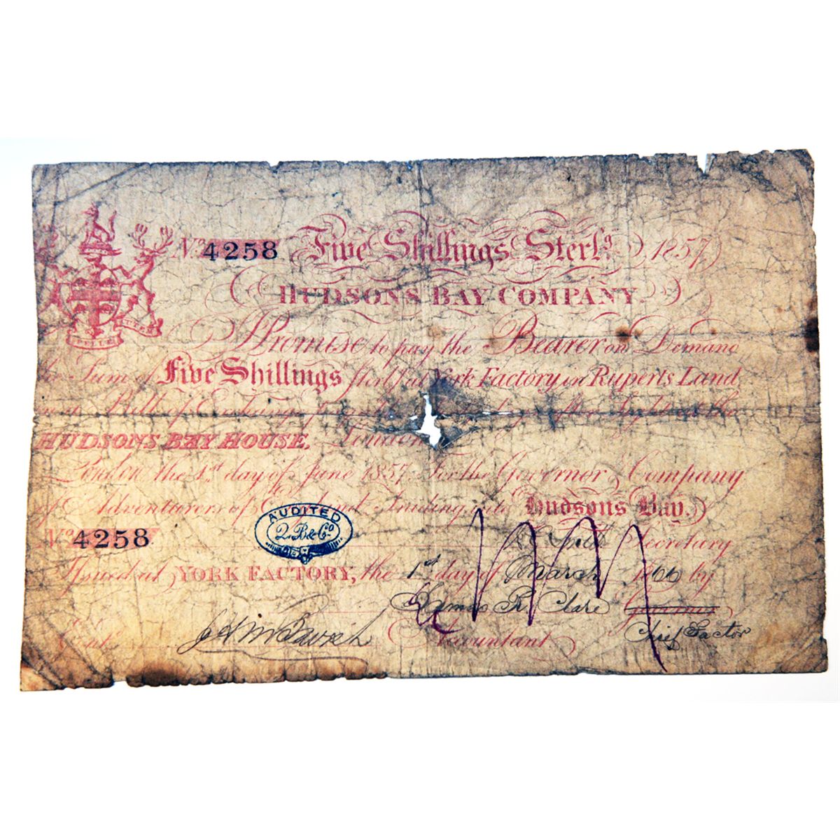 HUDSON’S BAY COMPANY. Five Shillings. York Factory Issue. London Date: 1 June, 1857. York Date: 20 Mar., 1866. Secretary: Wm. Smith. Governor: James R. Clare, Chief Factor. Accountant: J.H. MacTavish. Gingras 323. CH-MB10-10-04j-iii. No. 4258. R-6. 20cm x 13 cm. Small hole in center of note. Signature at right cancelled with ink. Stamped “Audited L.B. & Co.” in oval stamp at lower left. VG