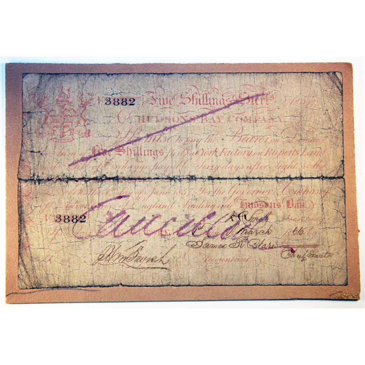 HUDSON’S BAY COMPANY. Five Shillings. York Factory Issue. London Date: 1 June, 1857. York Date:20 Mar., 1866. Secretary: Wm. Smith. Governor: James R. Clare, Chief Factor. Accountant: J.H. MacTavish. Gingras 323. CH-MB10-10-04j-iii. No. 03882. R-6. 20cm x 13 cm. Mounted on thin cardboard. Cancelled in writing by ink. VG.