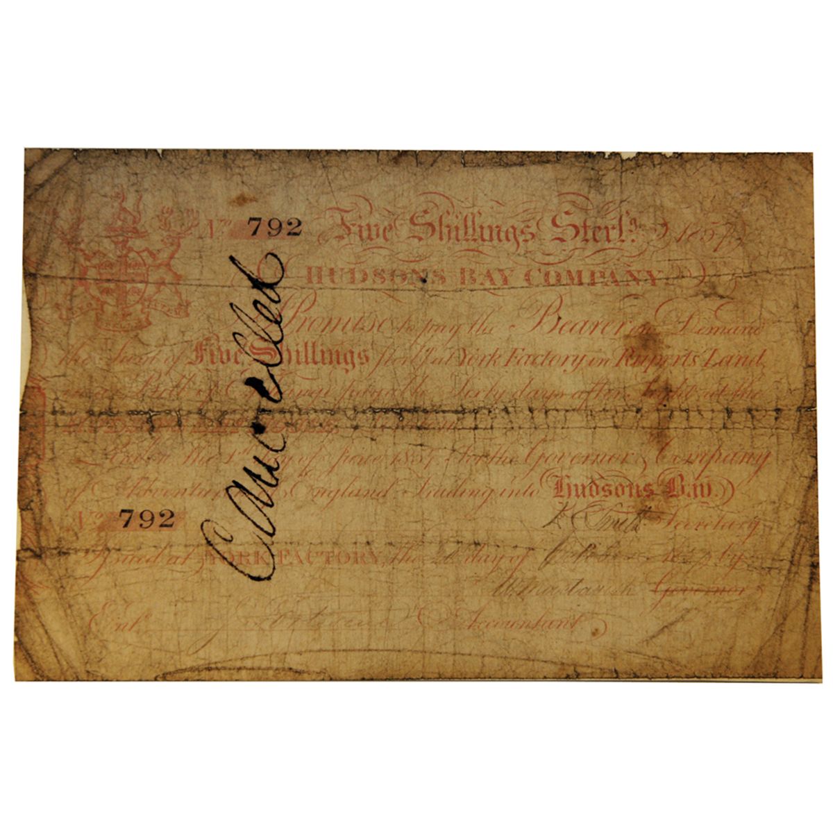 HUDSON’S BAY COMPANY. Five Shillings. York Factory Issue. London Date: 1 June, 1857. York Date: 20 Oct., 1857. Wm. Smith. Wm. MacTavish, Chief Factor. Accountant: J. Fortescue. Gingras 3201. CH-MB10-10-04j-i. No. 792. R-6. 19 1/2cm x 13cm. Mounted on thin paper. Cancelled in writing by ink. VG.