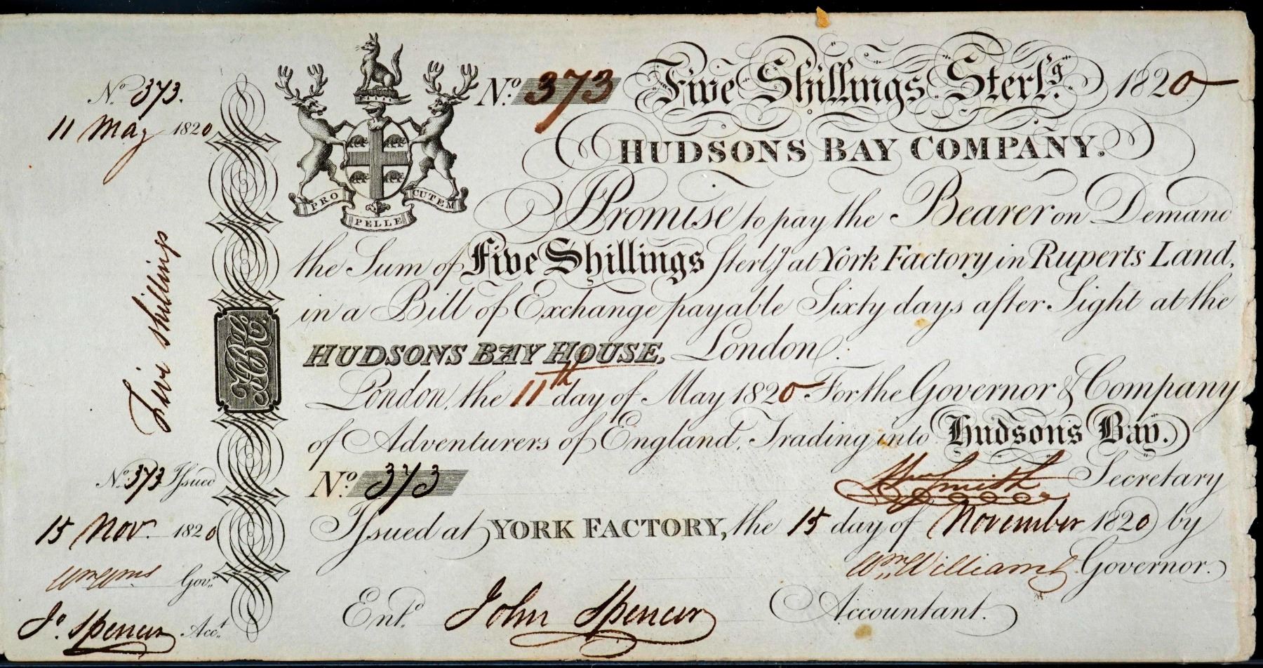 HUDSON’S BAY COMPANY. Five Shillings. York Factory Issue. London Date: 11 May, 1820. York Date: 15 Nov., 1820. Secretary: Wm. Smith. Governor: Wm. Williams. Accountant: John Spencer. Gingras 312. CH-MB10-10-04b-iR. No. 366. R-5. 25cm x 12cm. A fully signed Remainder, with intact counterfoil at left., #373, WMG Choice About Uncirculated-53.