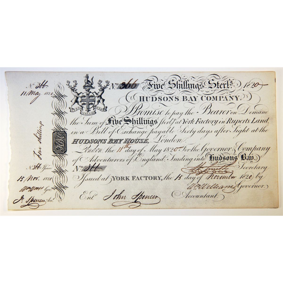 HUDSON’S BAY COMPANY. Five Shillings. York Factory Issue. London Date: 11 May, 1820. York Date: 15 Nov., 1820. Secretary: Wm. Smith. Governor: Wm. Williams. Accountant: John Spencer. Gingras 312. CH-MB10-10-04b-iR. No. 366. R-5. 25cm x 12cm. A fully signed Remainder, with intact counterfoil at left. AU.