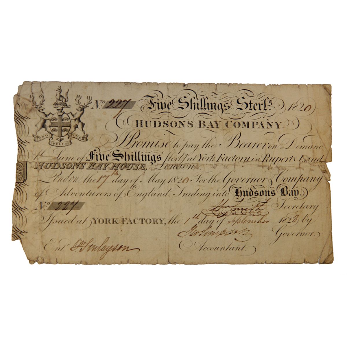 HUDSON’S BAY COMPANY. Five Shillings. York Factory Issue. London Date: 17 May, 1820. York Date: 1 Sept., 1820. Secretary: Wm. Smith. Governor: Geo. Simpson. Accountant: Dan Finlayson. Gingras 314. CH-MB10-10-04c. R-8. (3 to 5 known). 19cm x 11cm. Torn horizontally and repaired with old white thread sticking. The body of the note is Fine or better.