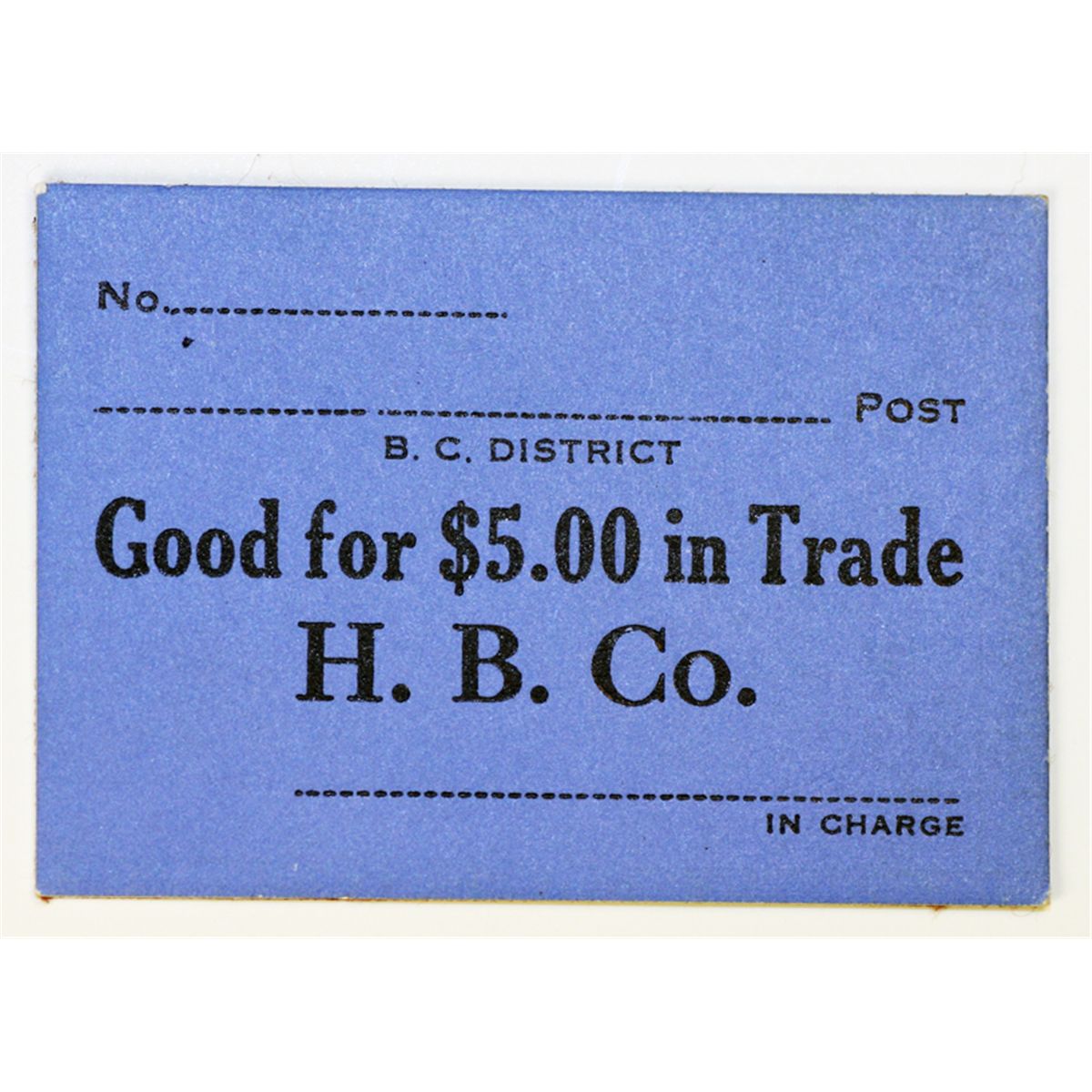 HUDSON’S BAY COMPANY. Generic note for $5.00 in Trade. No Date. Blue cardboard with black printing. 64mm x 44mm. Gingras 386. CH-BC10-18-08Ra. No Date. Maroon cloth backing. Believed to be a reproduction, produced in the 1960’s.