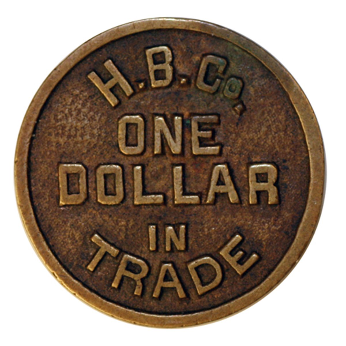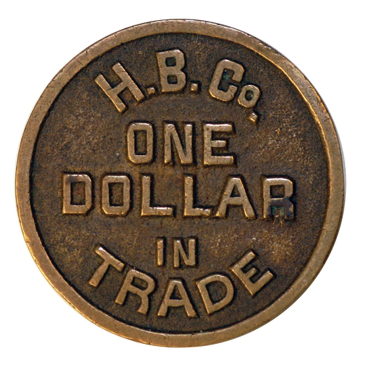 HUDSON’S BAY COMPANY. H.B.C. Co/ONE DOLLAR/IN/TRADE. Biface. Copper. 31mm. A so-called cast token. It is not, but is struck on a cast flan. One of the famous Columbia District tokens. 31mm. Gingras-235b. R-7. VF.