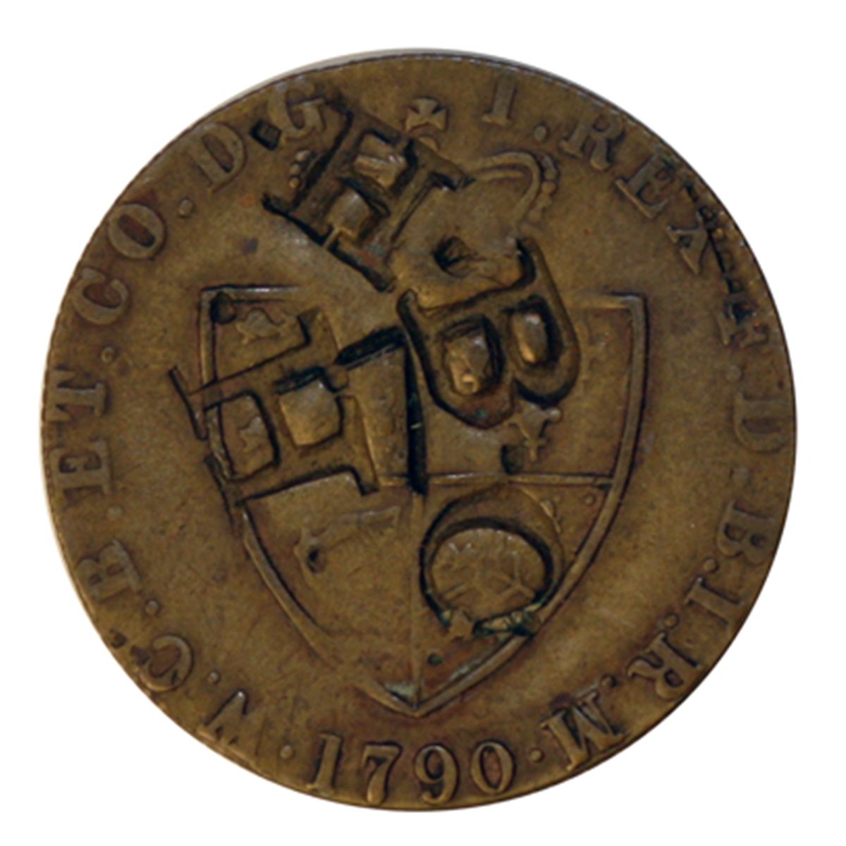 HUDSON’S BAY COMPANY. H.B.C./H. (for Hazelton). Countermarked on an imitation spade guinea, dated 1790, but after 1860. Brass. 25mm. Gingras-215a. Hill H3610e. VF.