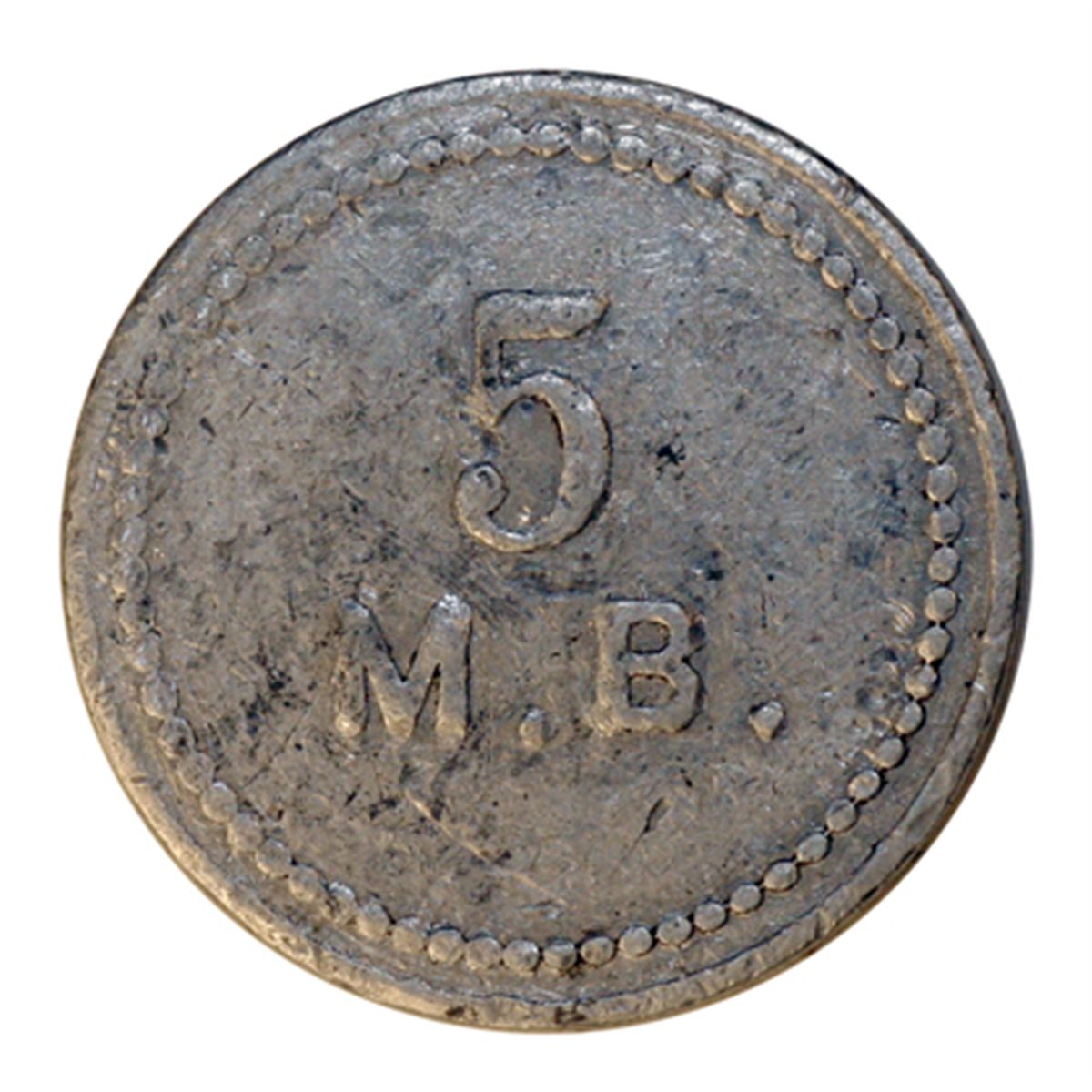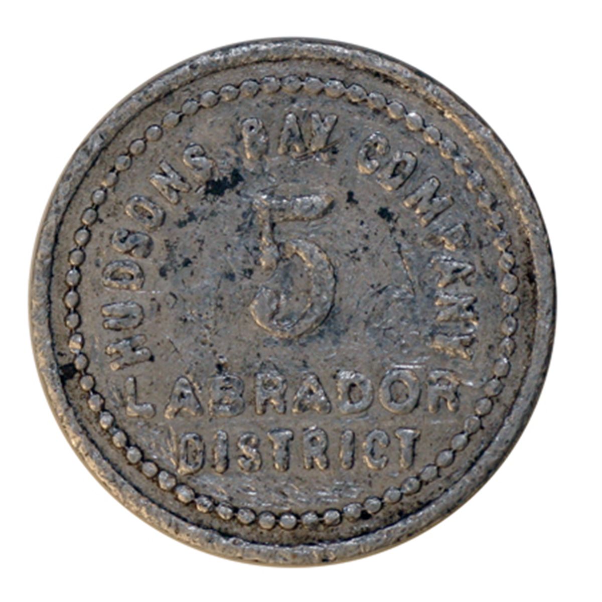 HUDSON’S BAY COMPANY. Labrador District. 5 MB token. Gingras-255f. A rare type from a different die than the preceding, and with the reverse inscribed 5/M.B. 25mm. R-10. Fine/VF. A prototype, according to L. Gingras in zinc and believed to be unique..