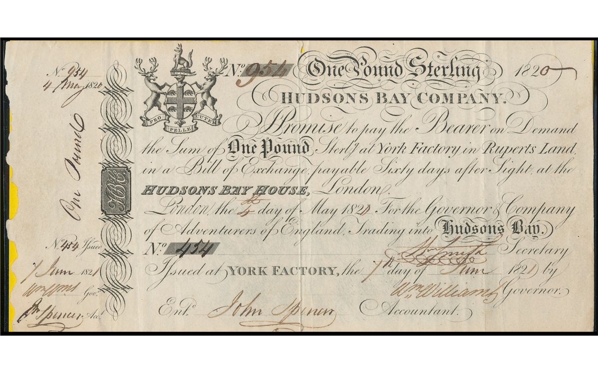 HUDSON’S BAY COMPANY. One Pound. York Factory Issue. London Date: 4 May, 1820. York Date: 7 June, 1821. Secretary: Wm. Smith. Governor: Wm. Williams. Accountant: John Spencer. Gingras 328. CH-MB10-10-06b-iiR. No.60. R-5. 23 1/2cm x 12cm. A Remainder, with