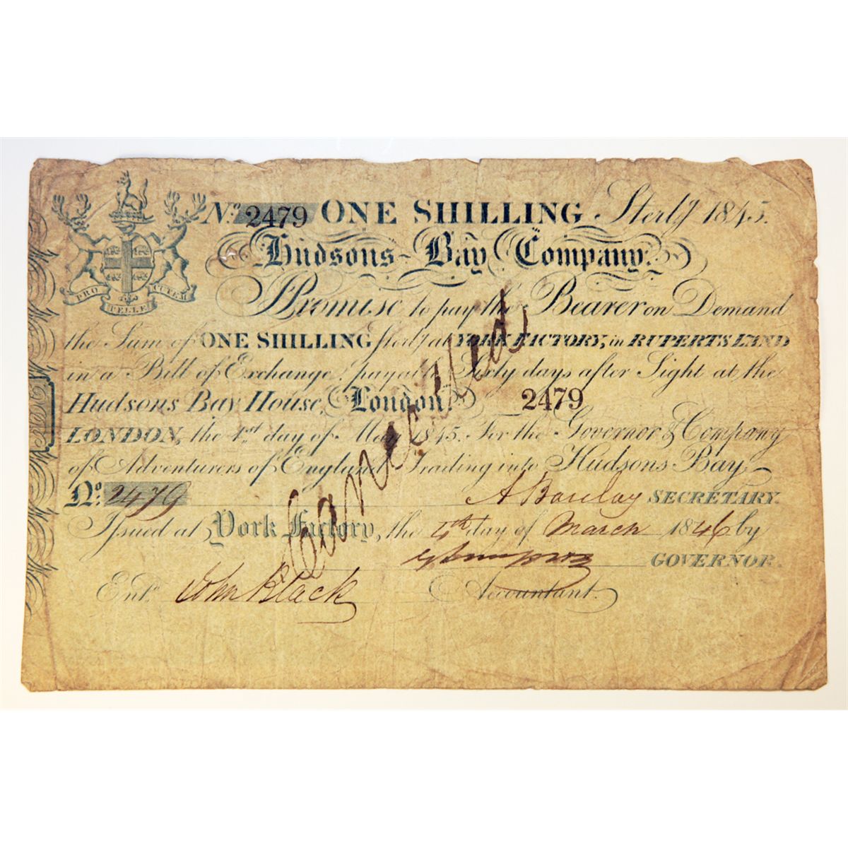 HUDSON’S BAY COMPANY. One Shilling. York Factory Issue. London Date: 1 May, 1845. York Date: 4 Mar, 1846. Secretary: A. Barclay. Governor: Geo. Simpson. Accountant: John Black. Gingras 305. CH-MB10-10-02f. No. 2479. R-7. 19cm x 13cm. VG. (Ex. Phillips auction, Lot #211, 2 June, 1994.The note has been cancelled