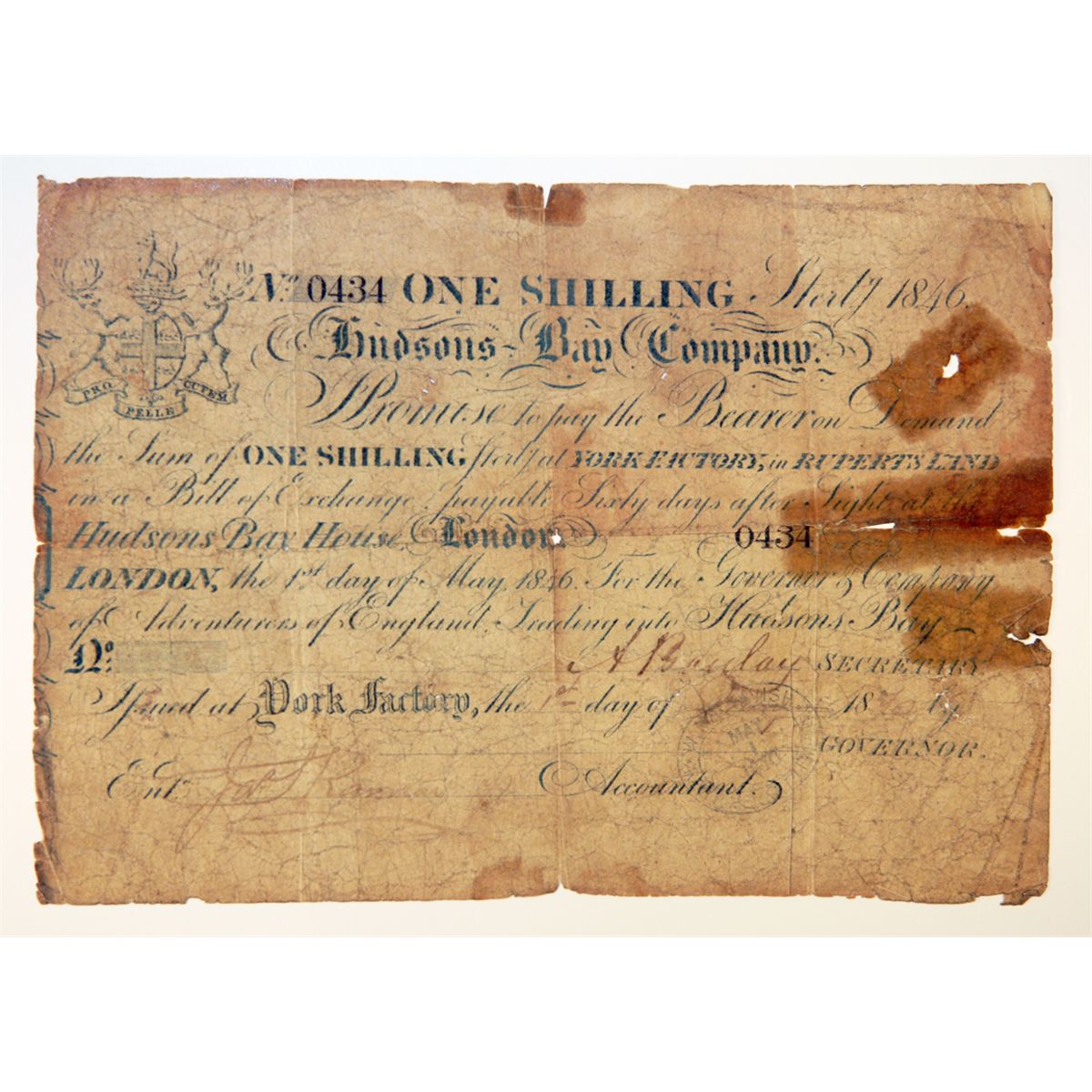 HUDSON’S BAY COMPANY. One Shilling. York Factory Issue. London Date: 1 May, 1846. York Date: 1 May,