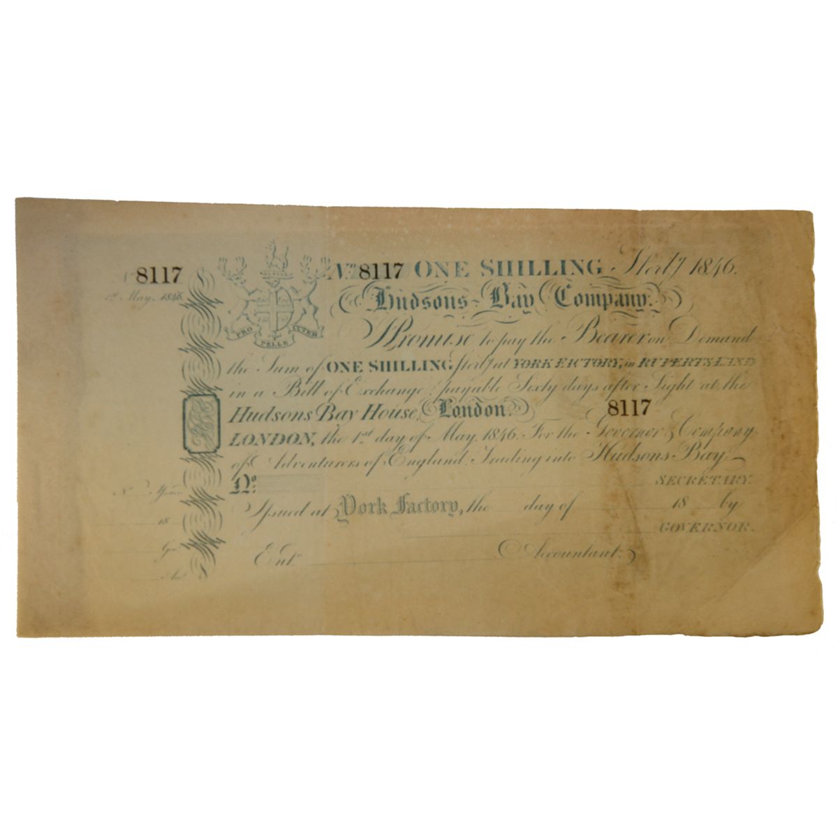 HUDSON’S BAY COMPANY. One Shilling. York Factory Issue. London Date: 1 May, 1846. York Date: 1 May,
