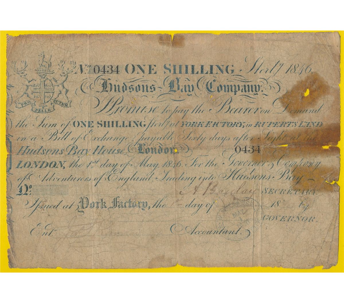HUDSON’S BAY COMPANY. One Shilling. York Factory Issue. London Date: 1 May, 1846. York Date: 1 May, 1870. Secretary: A. Barclay. Governor: MacTavish stamp. Accountant: Jas Ramsay. Gingras 306. CH-MB10-10-02g. No. 0434. A consecutive note to the above. R-6