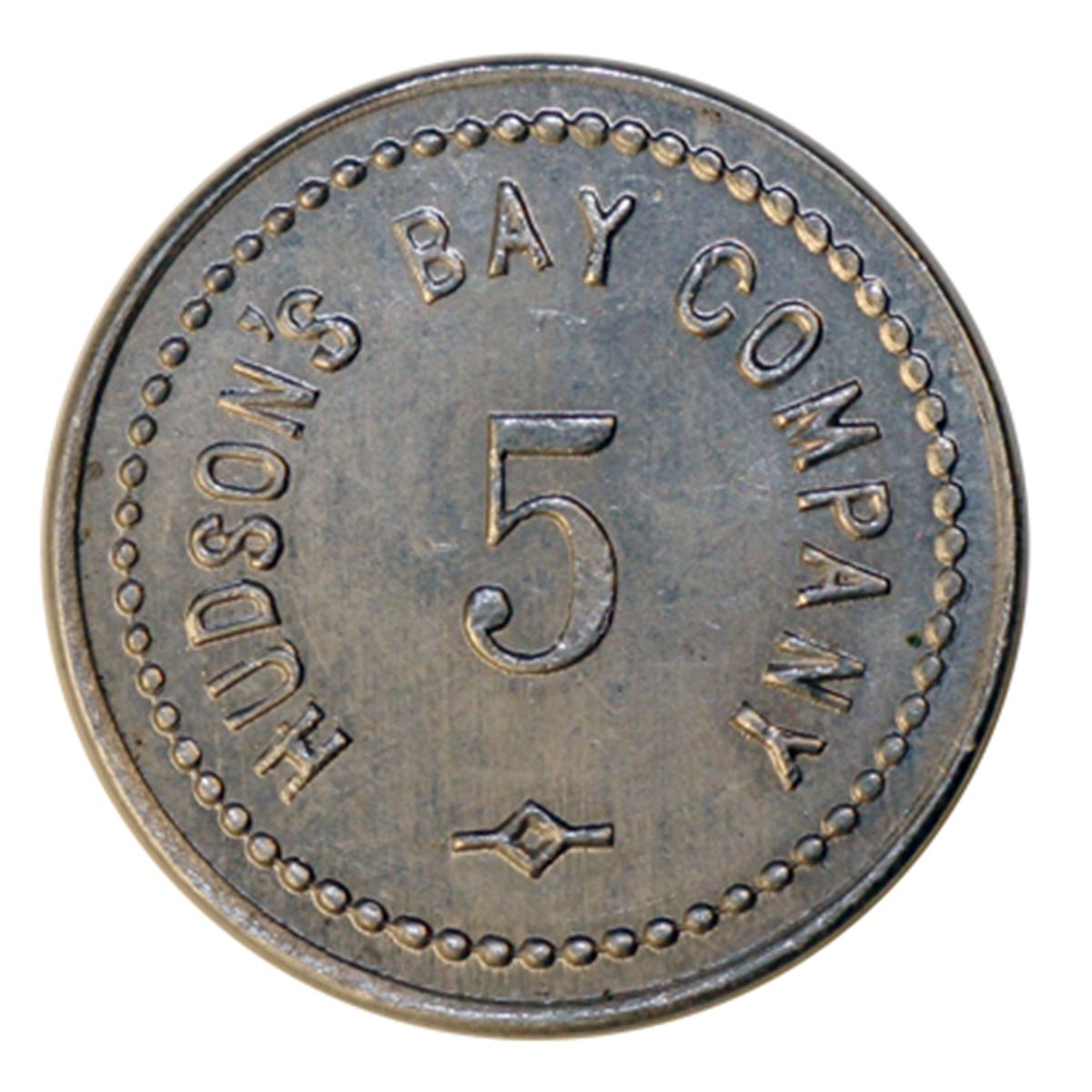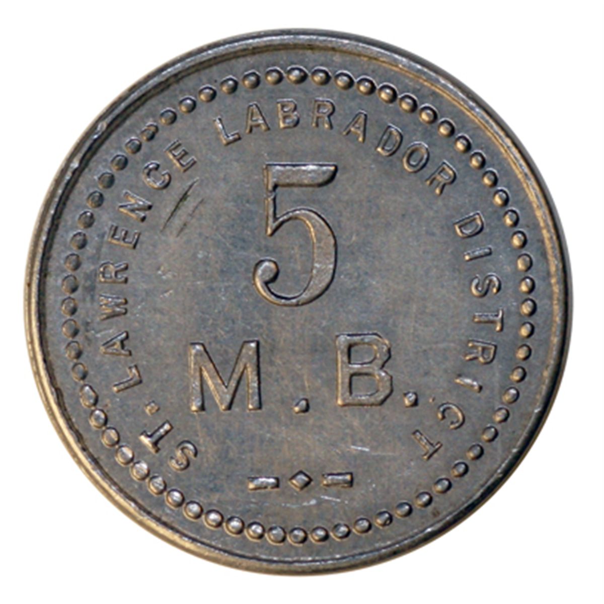 HUDSON’S BAY COMPANY. St. Lawrence Labrador District. 5 MB token. Gingras-260a. Alum. Small lettering. 25mm. EF.