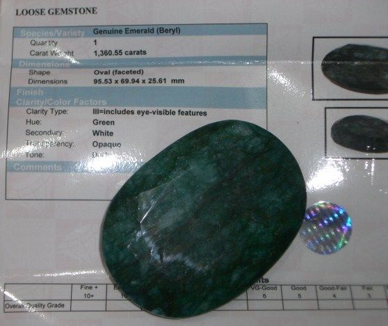 HUGE 1,360.55 CARAT GENUINE EMERALD VALUED AT $45,579.00 *COMES WITH APPRAISAL BY GLA-GEMOLOGICAL LABORATORY OF AMERICA*!! ***Coin, Currency & All Items Listed in this auction - Grades, Conditions and Values are not Safe Deposit Coins LLC Responsibilty. Grades, Condition and Values are determined by Consigner(s) & Buyers ONLY